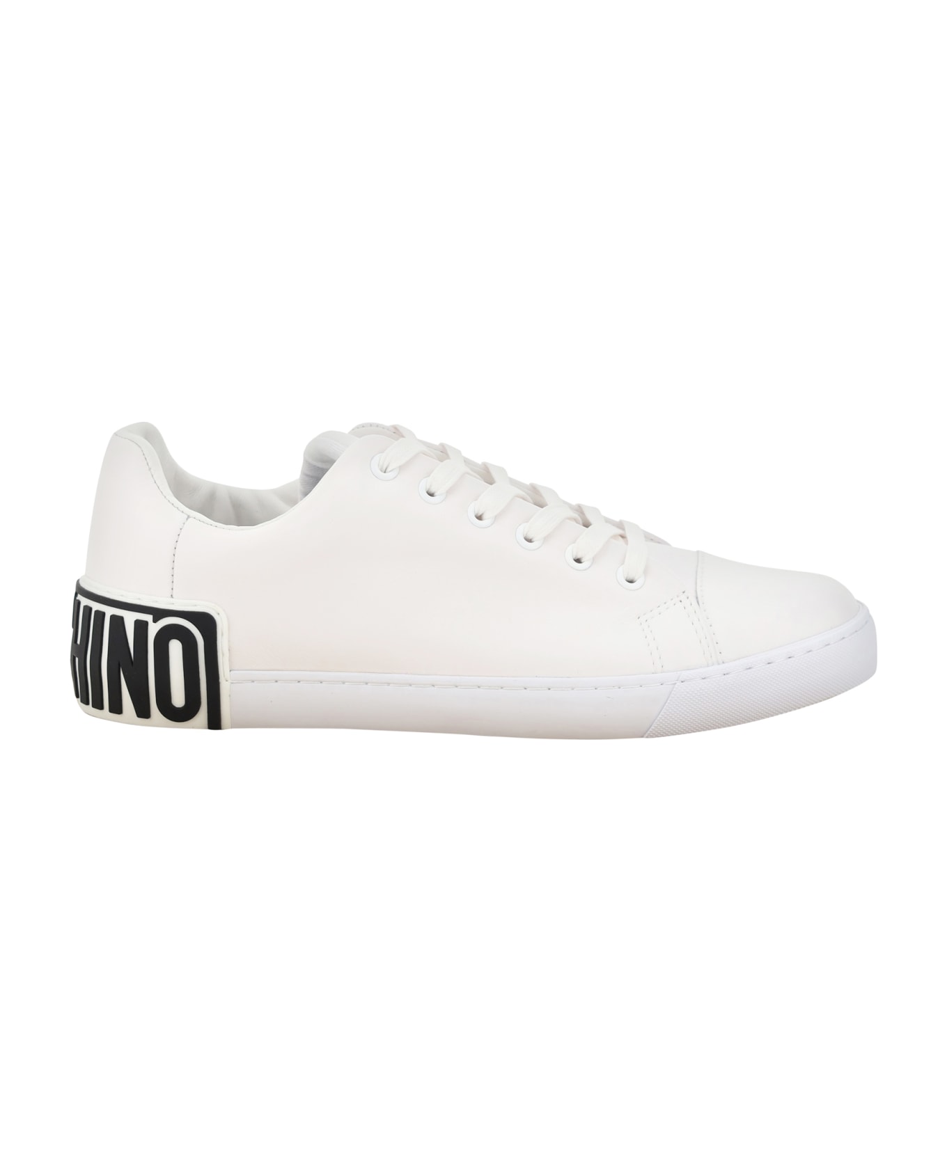 Calfskin vulc 25 sneakers by moschino, round toe, a lace-up front closure, a contrasting iconic brand signature on the back, and a flat sole.