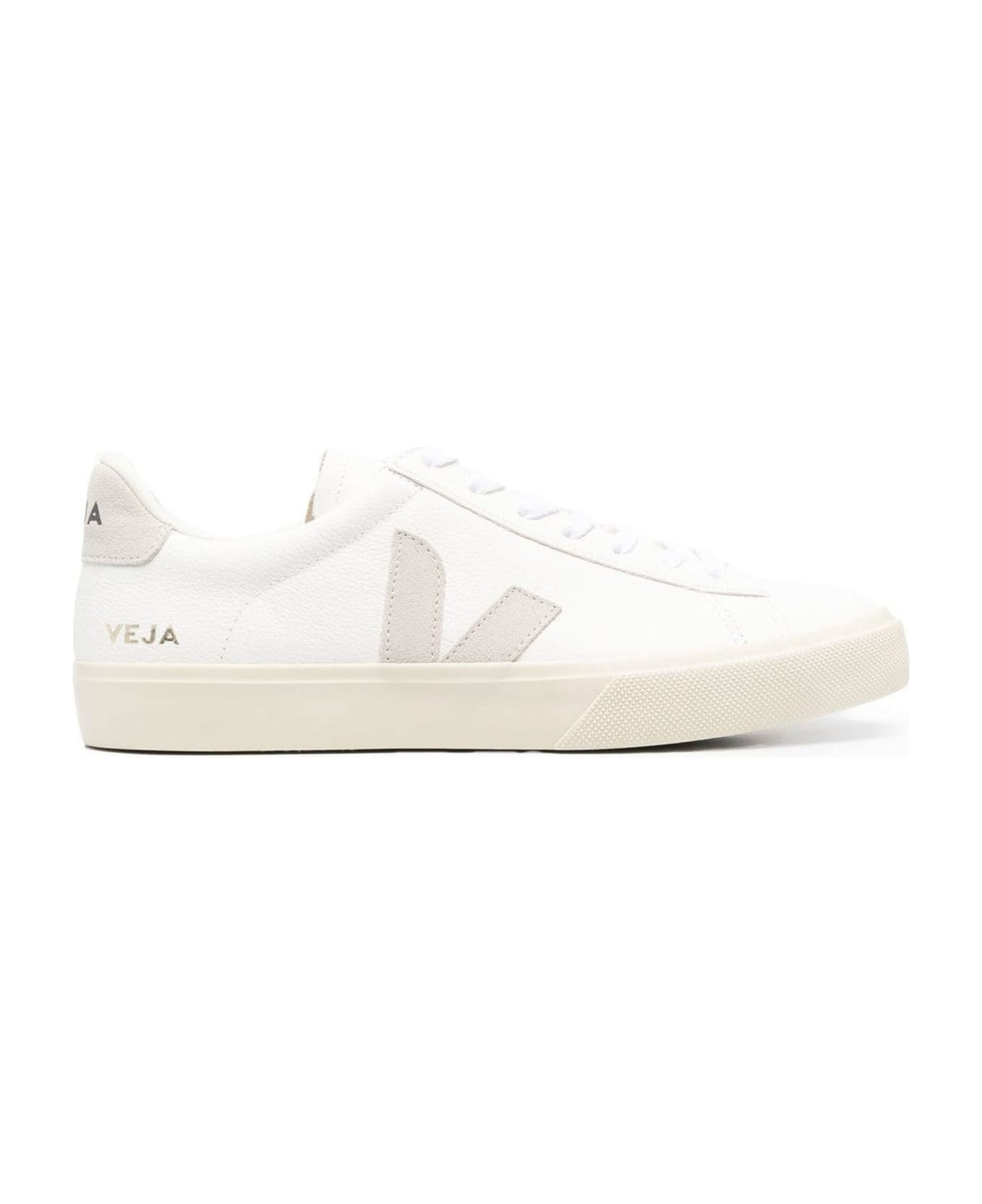 White and light beige Campo sneakers, ChromeFree leather, round toe, front lace-up closure, logo on the heel, side logo application, insole with logo and flat rubber sole