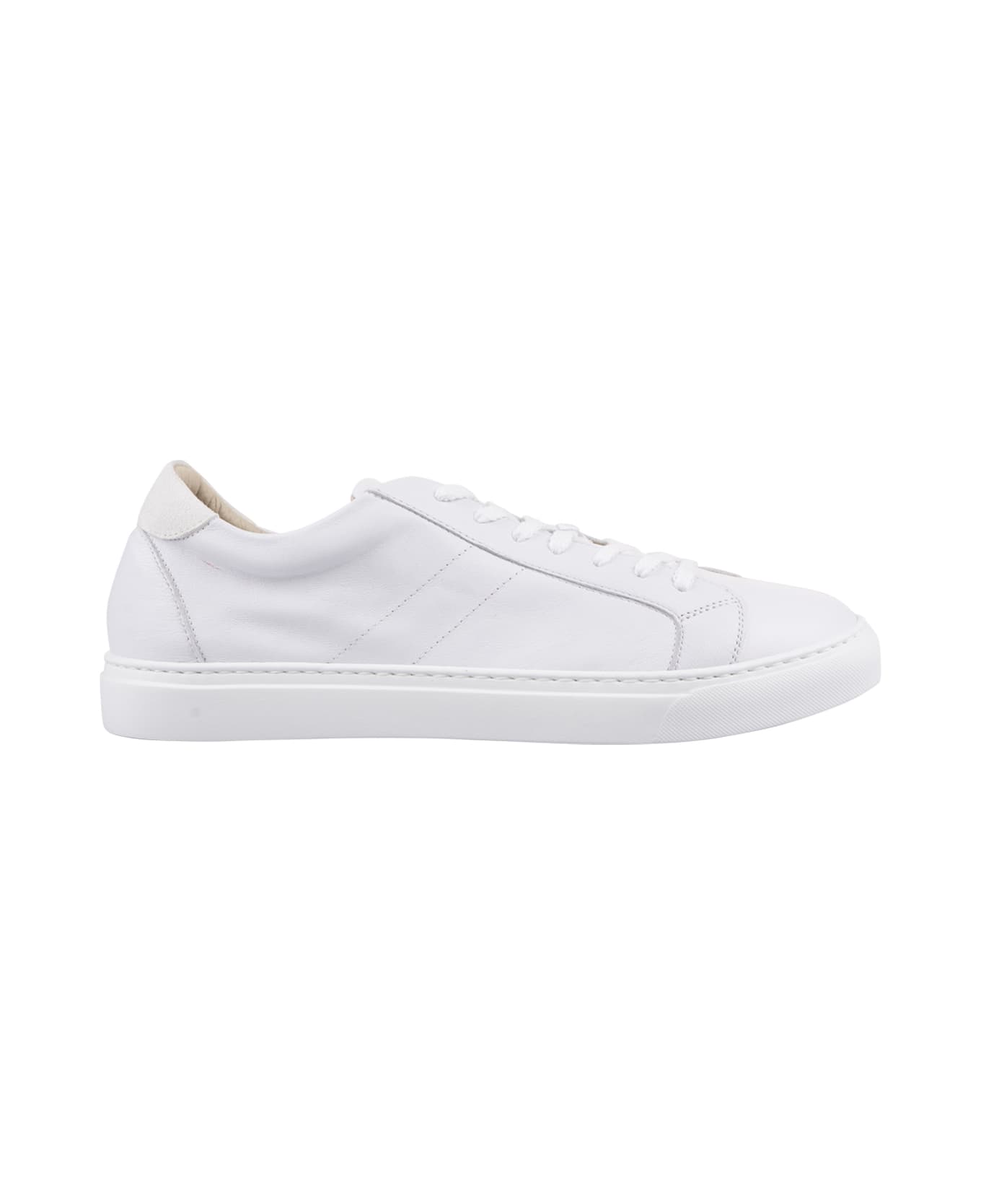 Andrea Venura low sneakers made of white leather with round toe, lace-up design, white rubber sole, white suede spoiler and white suede logoed label applied on the tongue.