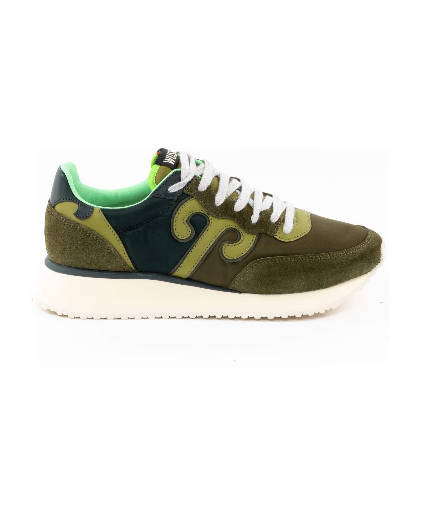 Wushu Ruyi sneaker in green leather and technical fabric, leather details, logo inserts, white laces, white rubber sole, green laces supplied.