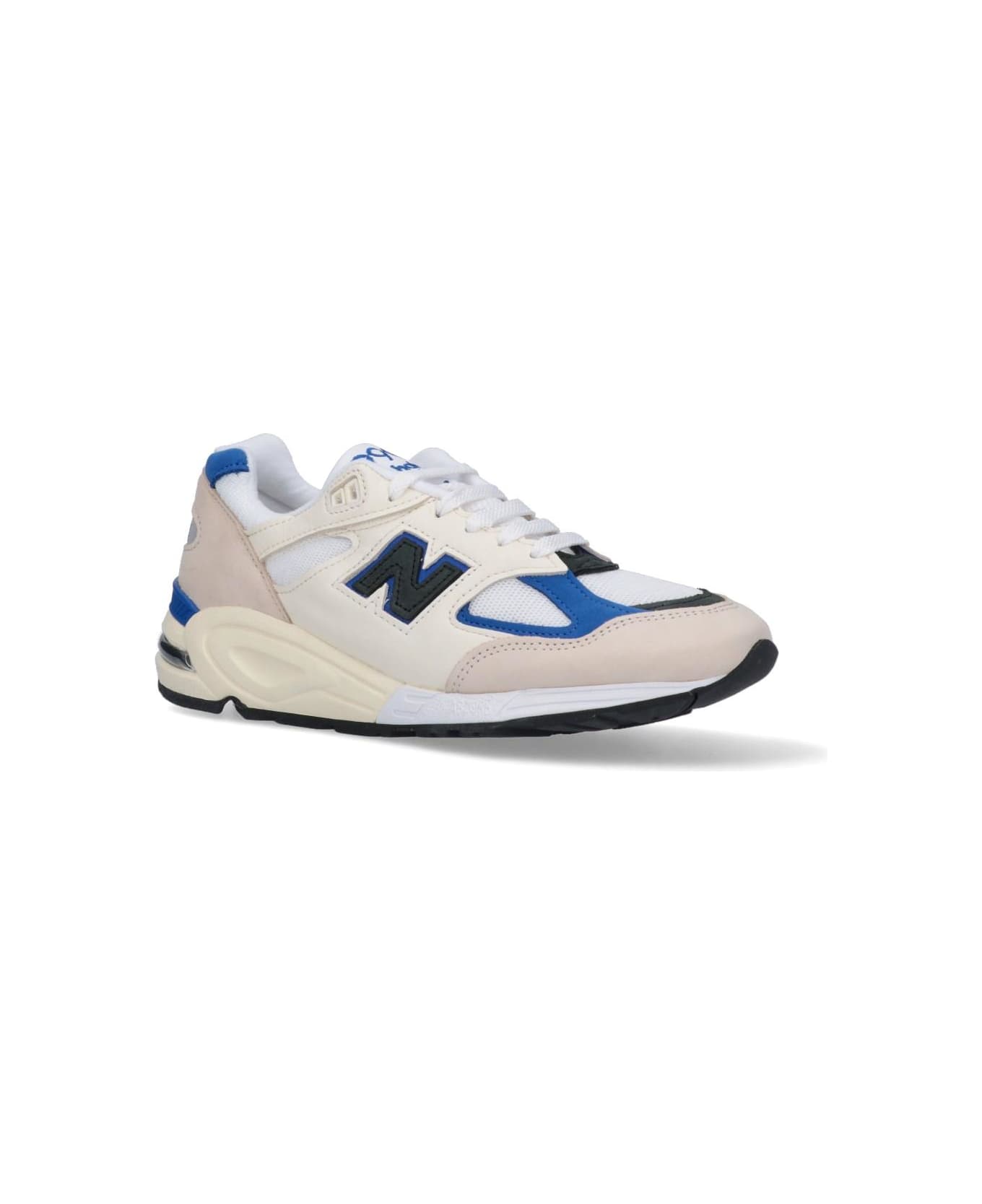 Teddy Santis X New Balance Sneakers '990v2', cream and blue leather upper, white mesh details, round toe, lace-up closure, logo embroidery tongue, black logo patch on side, 'USA' embroidery back, cushioned rubber sole.