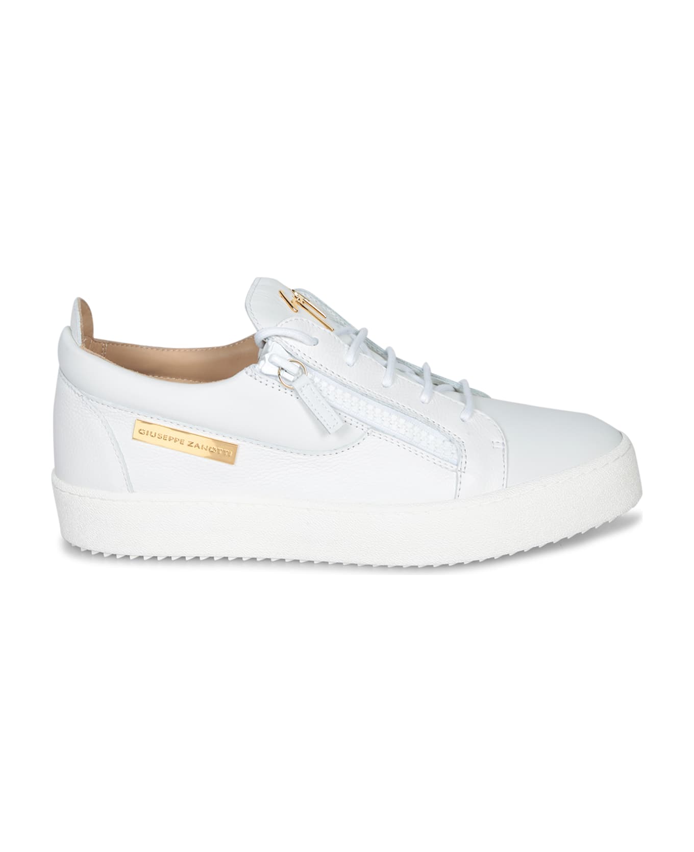 Contemporary charm meets urban luxury in these Giuseppe Zanotti soft white leather sneakers, finished with gold details and a practical side zip closure that defines a distinctive and sophisticated style.