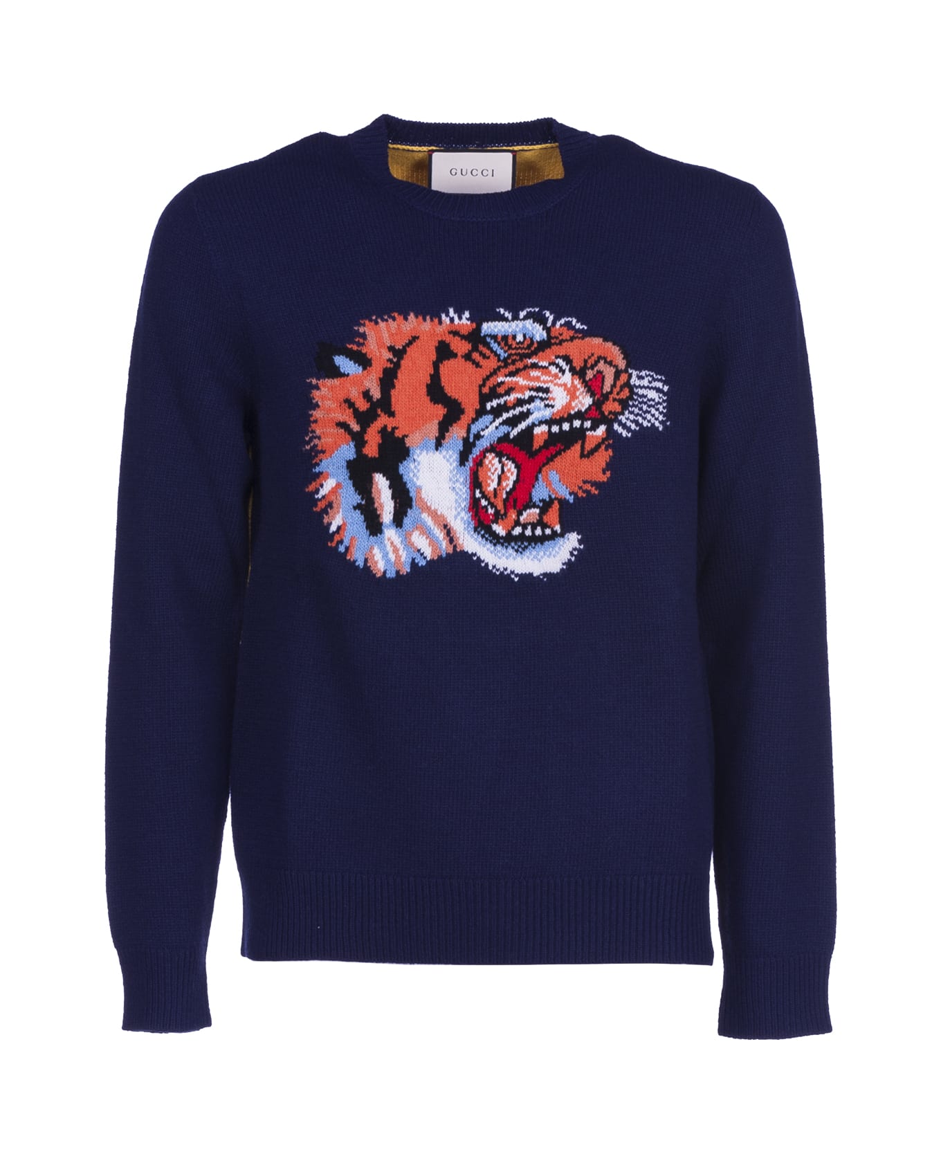 Wool sweater with tiger intarsia from GUCCI: Blue wool sweater featuring Tiger intarsia on the front, 'Loved' intarsia on the back, Crew neck and Rib trims.