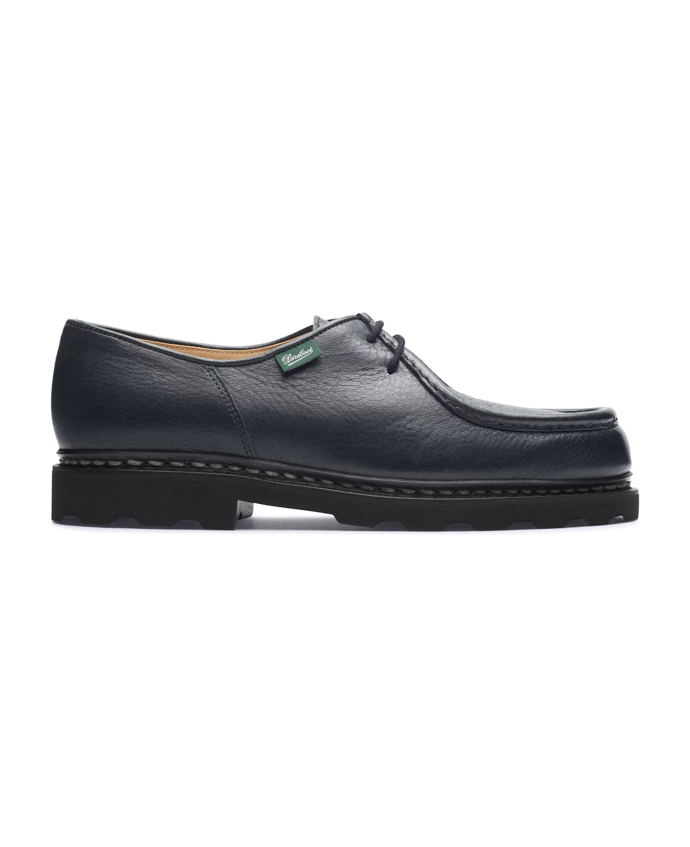 Paraboot footwear made of leather with 2 eyelets and a smaller but sturdy lace, a thick leather with protective relief, a sturdy stitching, a thick and comfortable insole, and finally a natural rubber sole.