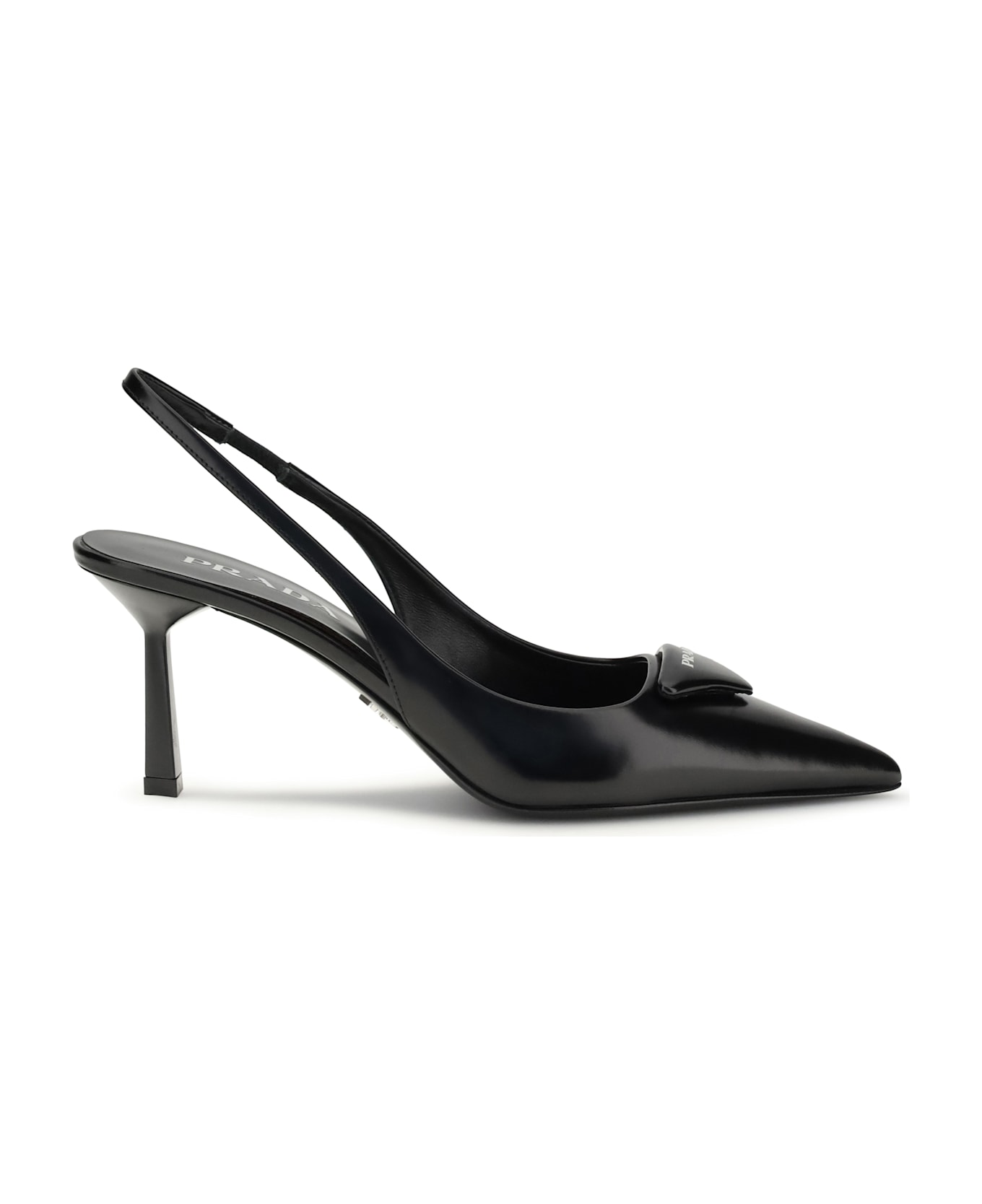 The leather slingback pumps by prada express contemporary elegance with clean lines and iconic details. made of smooth leather, they are embellished with the classic tonal leather triangle logo on the front. the pointed toe model is enhanced by a distinctively designed heel, while the elastic ankle strap ensures a comfortable and stable fit. the logoed label on the inside discreetly completes the maison's refined aesthetic. Composition: 100% % Calf Leather Bos Taurus