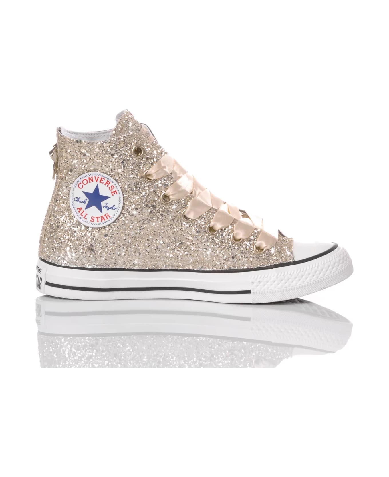 Converse All Star Full Champagne, the real queen of the party: it sparkles, it shines and it's colourful our full glitter is exactly what you need, fully covered in champagne glitter, sides, tongue and back: ALL. With these women's trainers everyone will envy your feet. The Converse All Star Full Champagne comes with cream satin laces in addition to its original white ones. For added comfort, we offer you our heel lift insole, which, in addition to comfort, gives you a few extra inches and an immediate figure-enhancing boost.