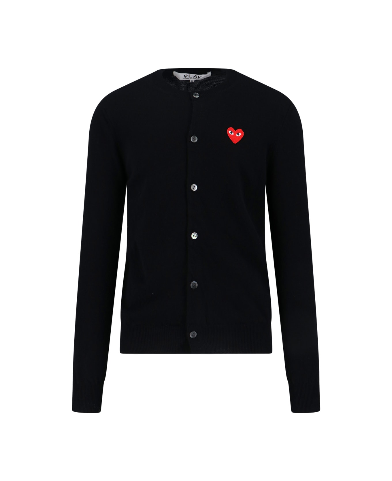 Comme des Garcons Play logo cardigan in black wool with crew neck, button closure, long sleeves, contrast logo embroidery at the front, ribbed trims, straight hem.