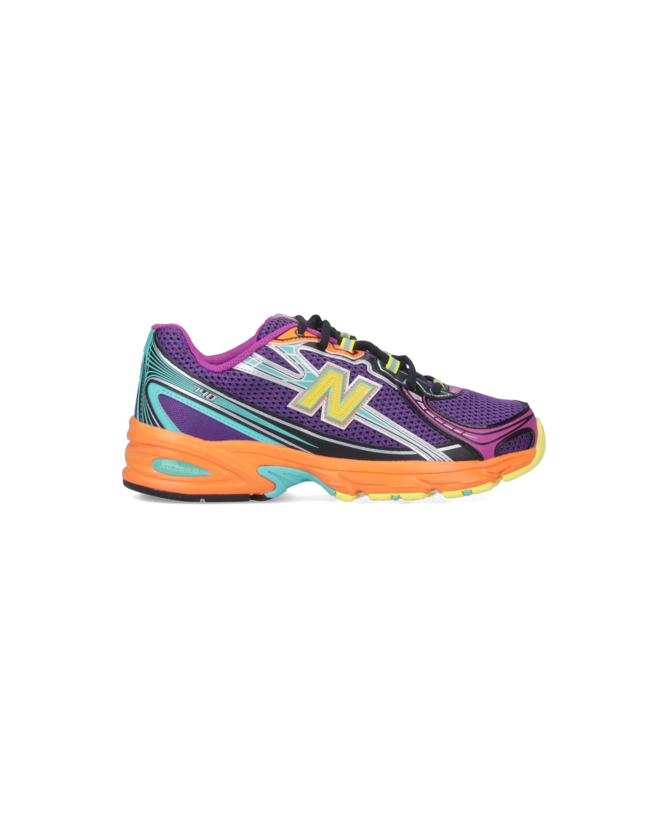 New Balance 740 sneakers in purple mesh with multicolor trim, round toe, laces, logo patch on tongue, yellow logo patch on the side, logo print on the side, logo print on the back tab, and textured rubber sole.