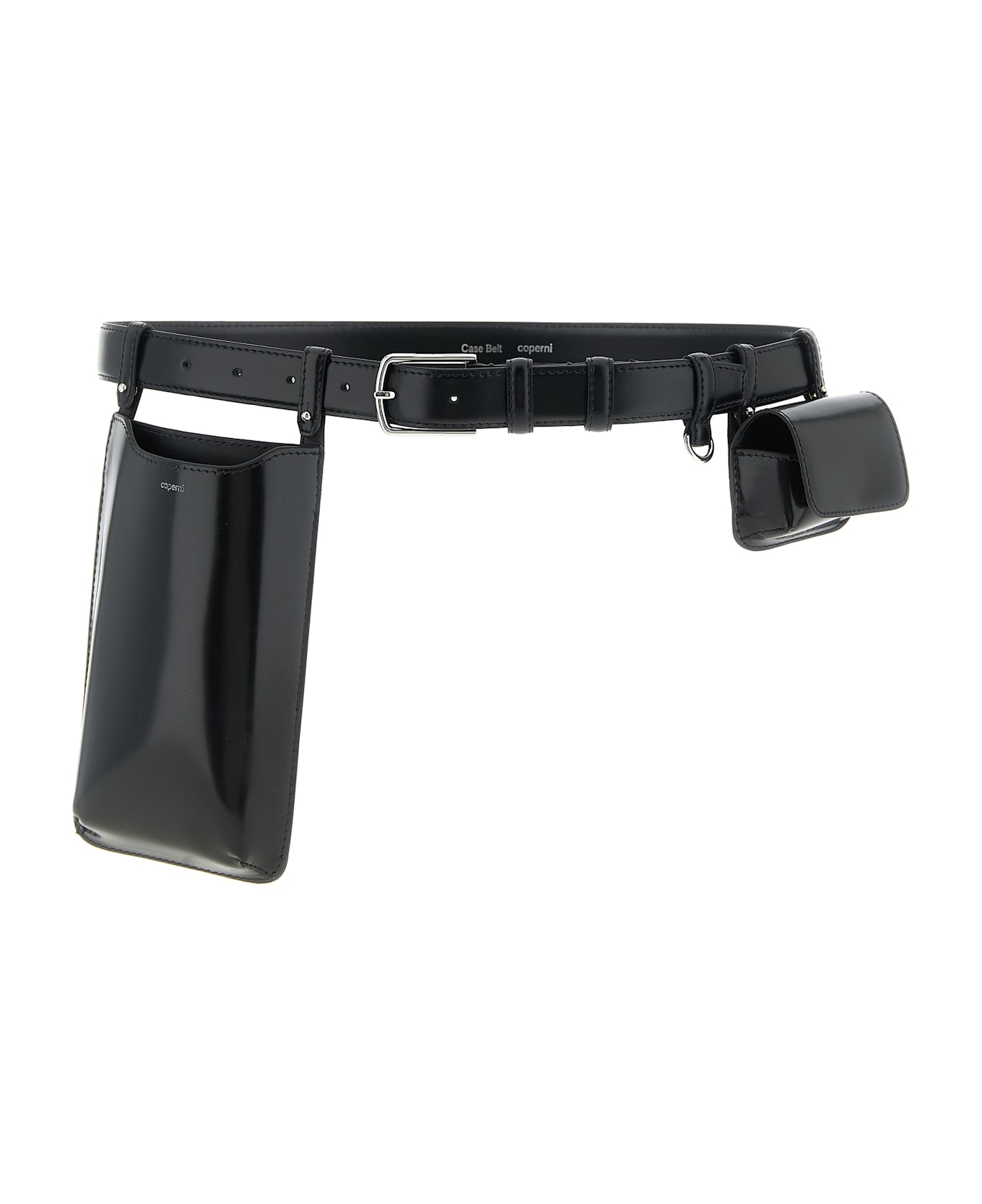 Case Belt' leather belt with glossy finish, modular construction that allows components to move and fit along the curve, removable compact case, slim and elongated removable pocket, metal buckle.