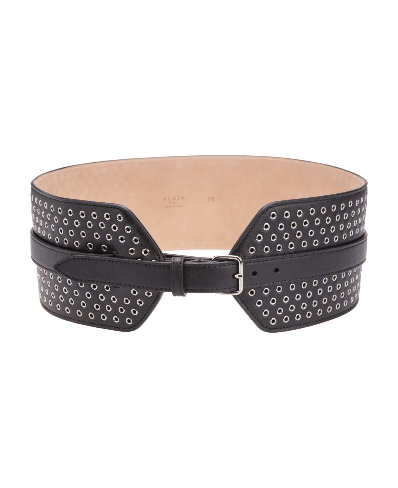 Sophisticated women's corset belt by Alaia made of fine perforated leather and finished with a thin buckle and silver all-over studs. The product fits perfectly to life. Belt height: 12 cm.