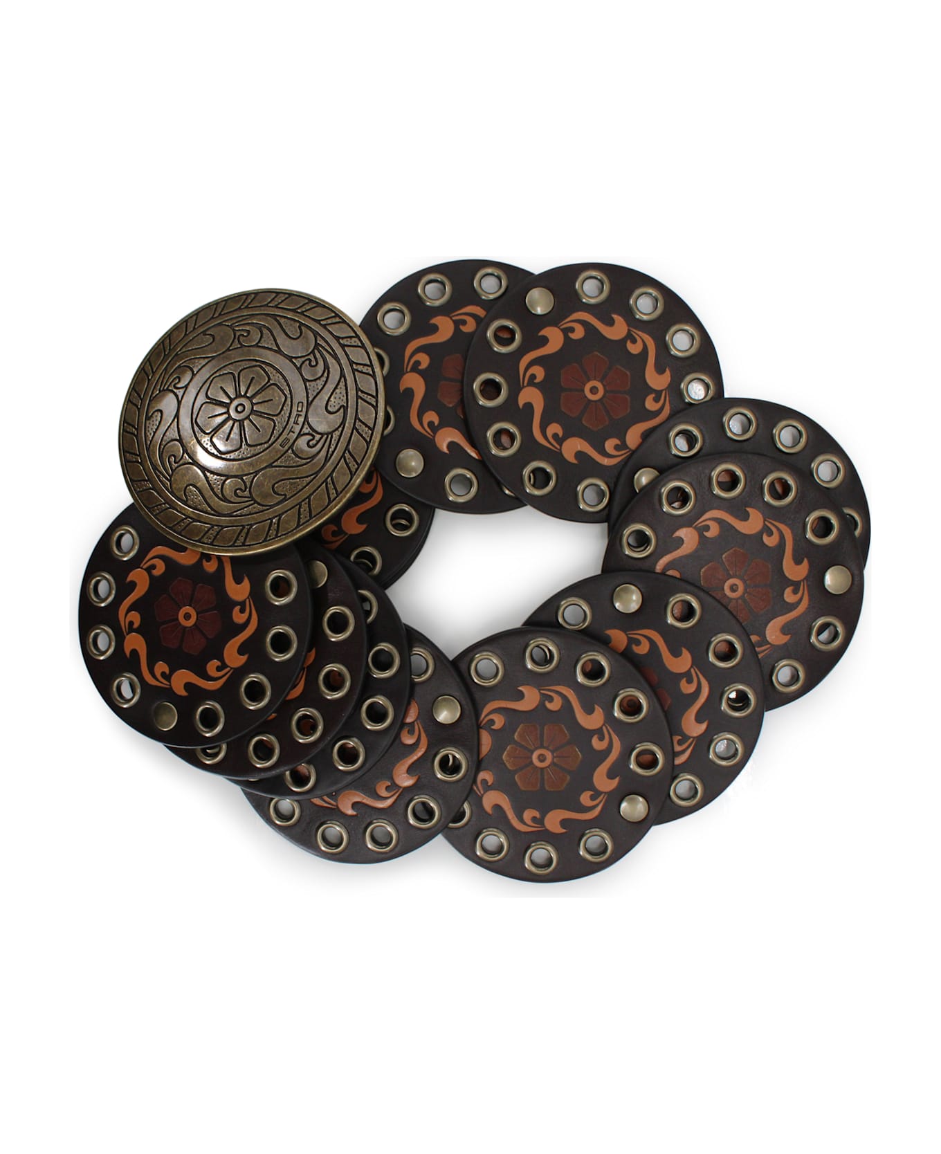 This belt is crafted in leather, featuring round studs with perforated details and a floral and abstract Paisley-inspired print. The metal buckle reflects the motif through engraved detailing and is accented with the ETRO logo.