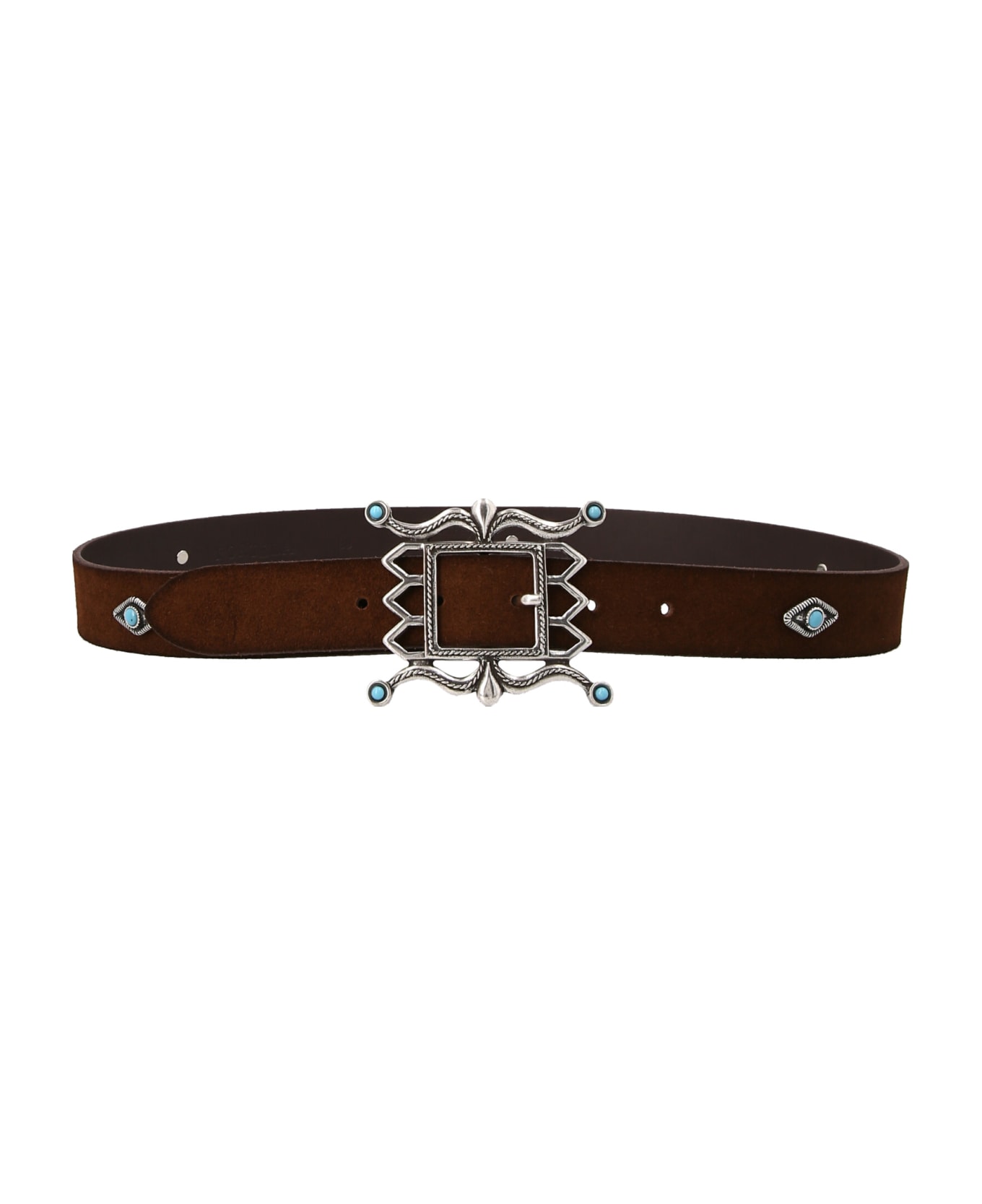 'Tea' leather belt with turquoise and stud applications, and processed metal buckle.