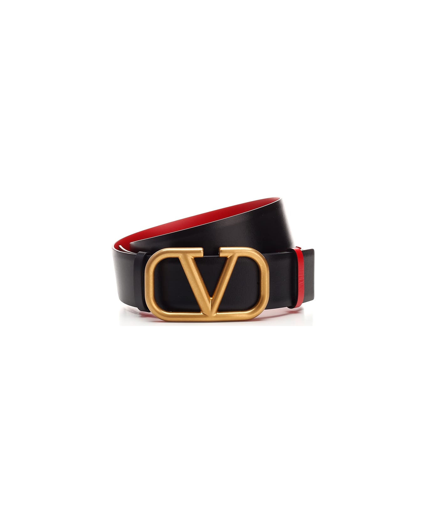 Black and red reversible "V-Logo" leather belt from Valentino Garavani with antique brass finish buckle. Composition: 100% CALF LEATHER