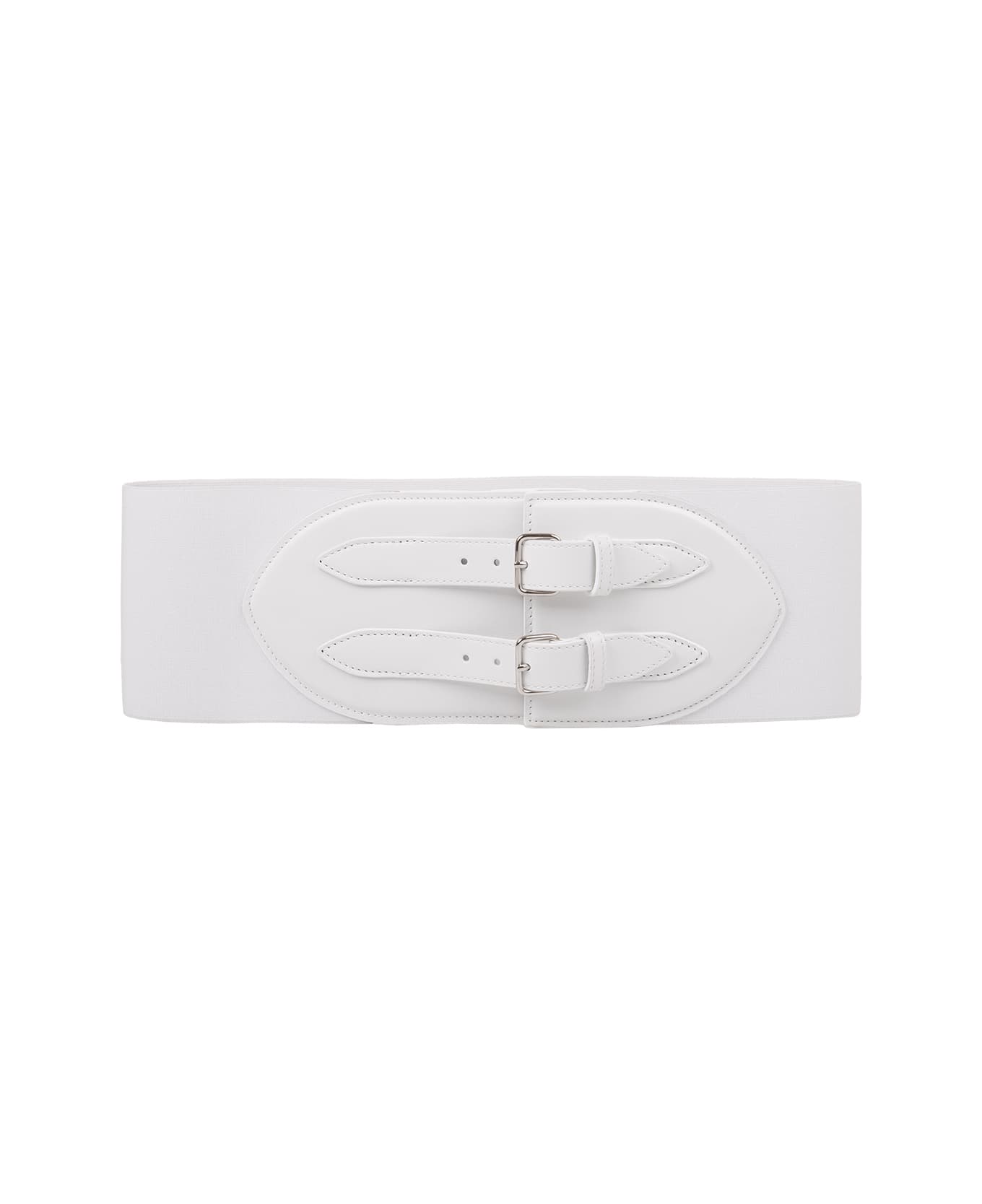 White stretch corset belt by Alaia made of leather and fabric with two buckles. The integral elastic offers optimum comfort and ease. Belt height: 10 cm.