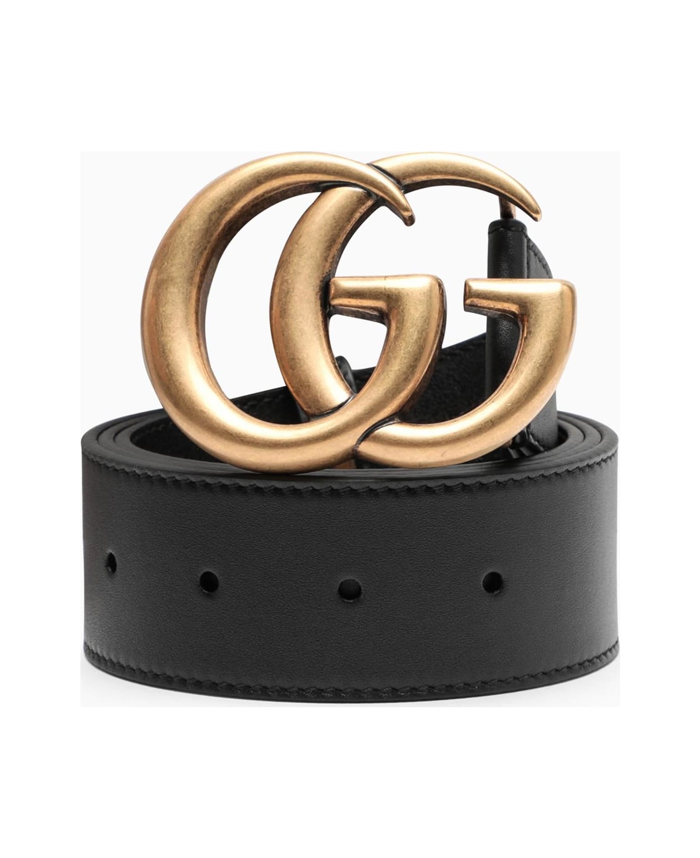 Belt by Gucci in black leather featuring antiqued brass hardware with a shiny finish and double G buckle. Composition: 100% Calf leather