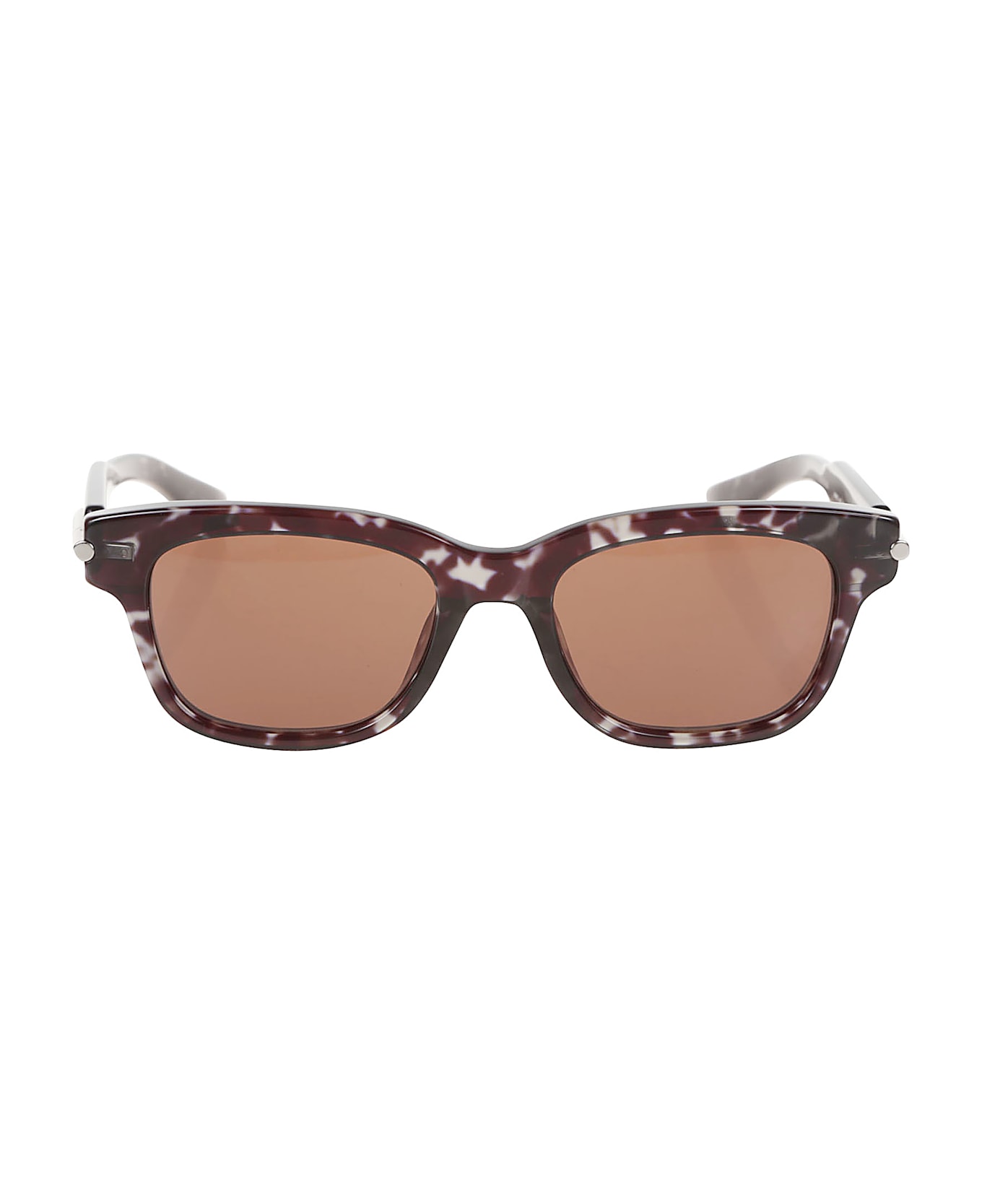 AM0497S acetate sunglasses by ALEXANDER MCQUEEN. Featuring a rectangular shape and iconic floating metal T-bar on the temples with a laser engraved McQueen logo. All Alexander McQueen glasses are 100% certified against UV rays (UVA and UVB). This frame can be equipped with prescription lenses.