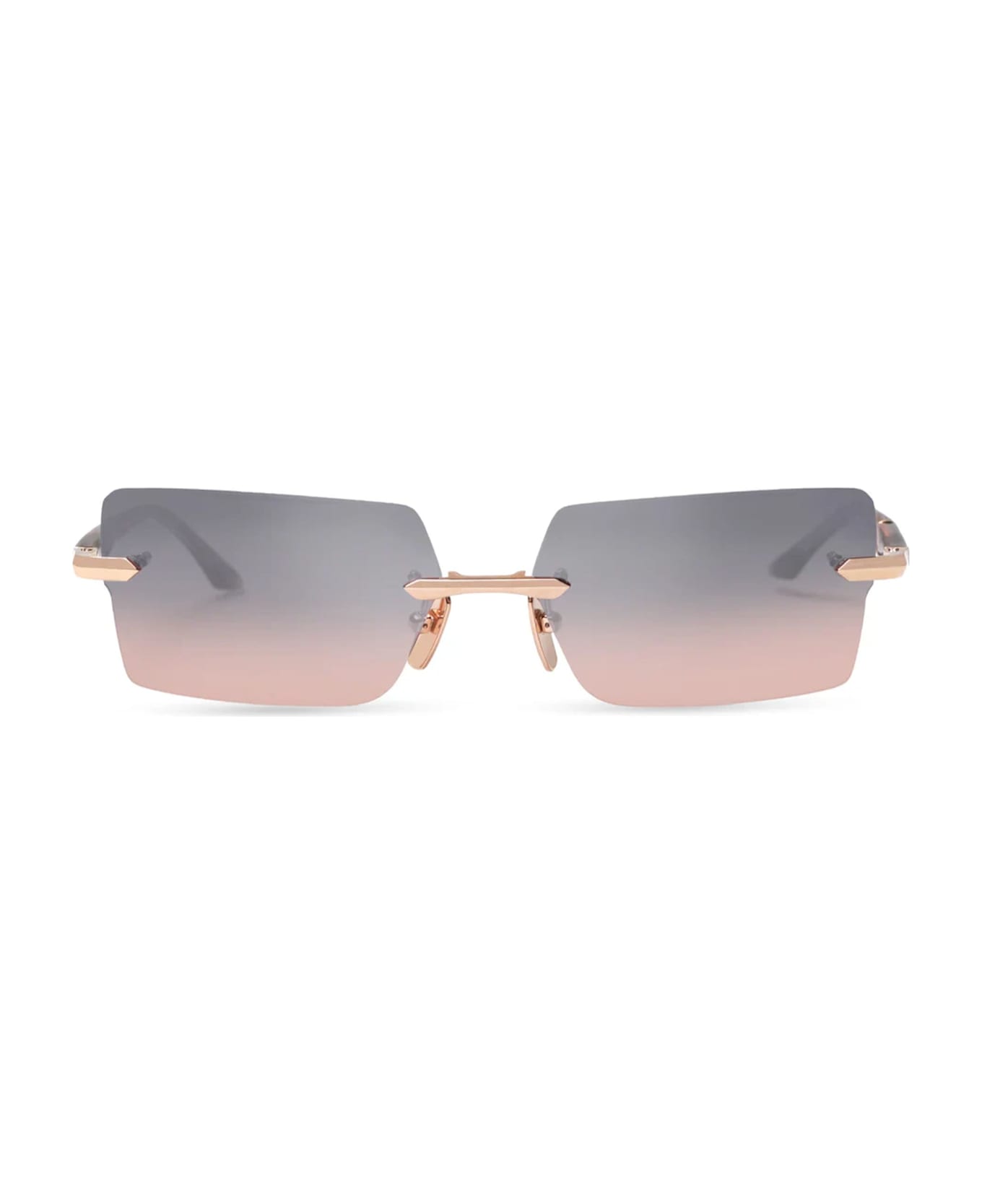 DITA EYMORI - ROSE GOLD / EL MIRAGE SWIRL (DTS462-A-02) are sophisticated rectangular rimless sunglasses, made in Japan. They feature rose gold titanium bridge, screw-mounted lenses, intricated titanium chamfered hinge block, dual sculpted titanium acetate temples, and gradient grey to peach CR39 4 base lens with 100% UV protection.