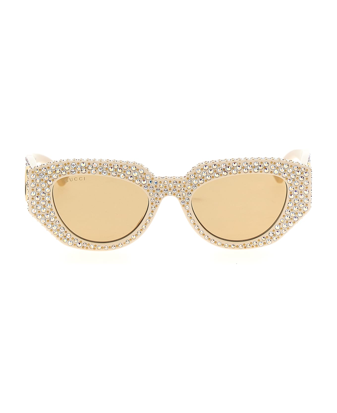 Geometric sunglasses with shiny acetate mount and crystals, shiny acetate rods with Double G. Total BRUEN/UVB protection. Composition: