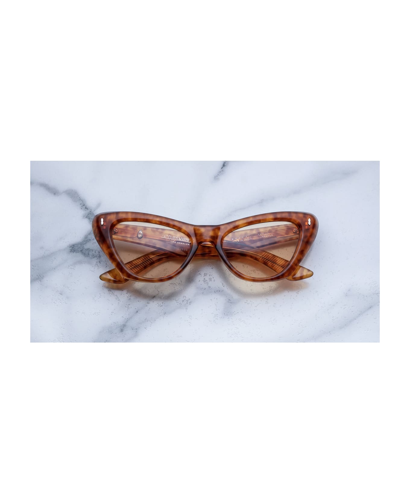 Jacques Marie Mage Kelly uplifting cat-eye w/powerful lines and a subtle silhouette, dark gold signature arrowhead front pin, light gold custom hairline engraved wire core design, light gold tension-secured custom hinge with spur-shaped rivets, light gold domed 3D metal cameo logo. 6 base CR39 lens w/ backside anti-reflective treatment, 100% UV protection