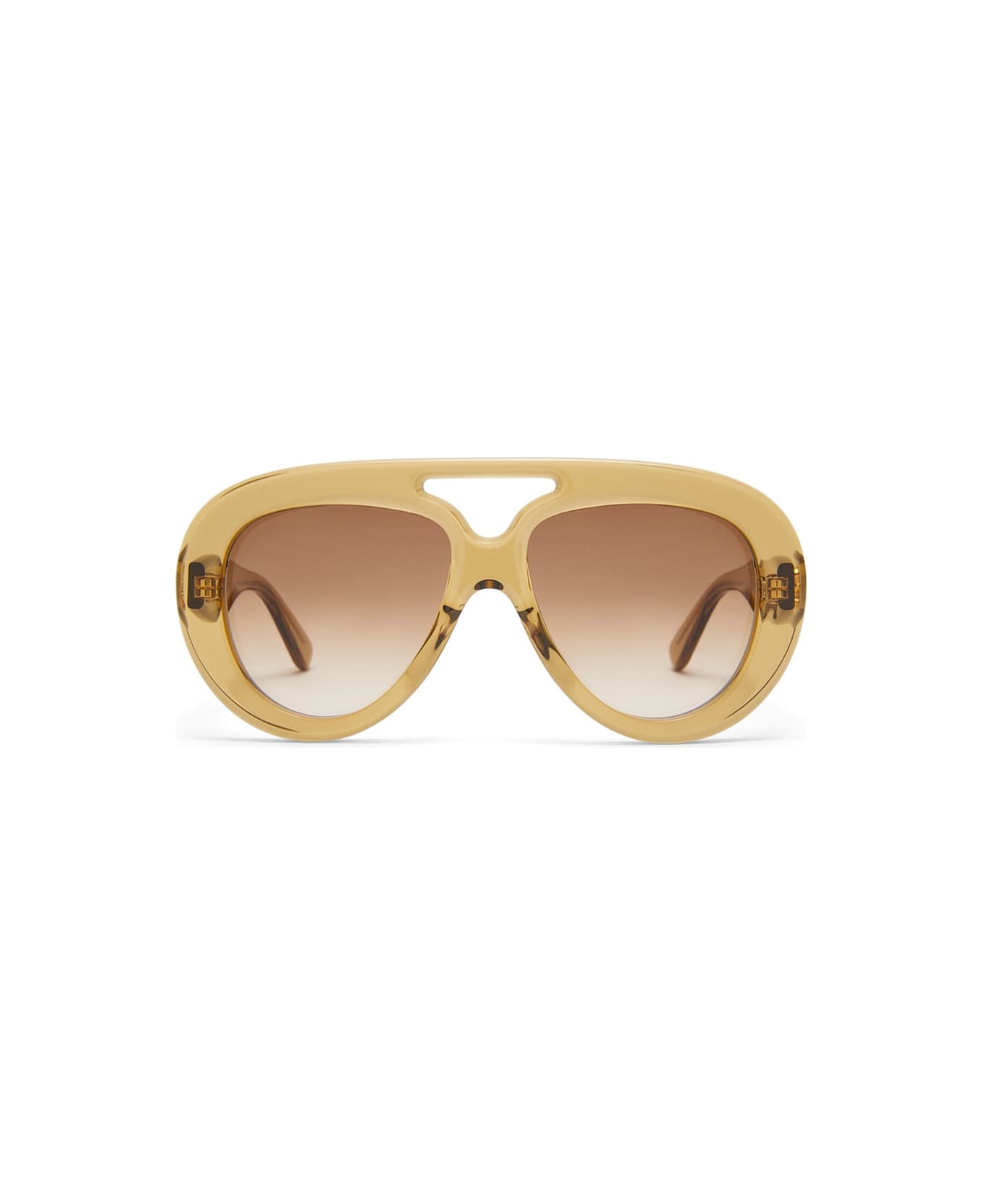 Loewe LW40144U - TRANSPARENT OLIVE (LW40144U5596F) are bold round aviator sunglasses made in Italy - part of the Loewe Eyewear Collection. They feature transparent olive green acetate frame, Loewe gold logo on temples, and gradient brown lens with 100% UV protection.
