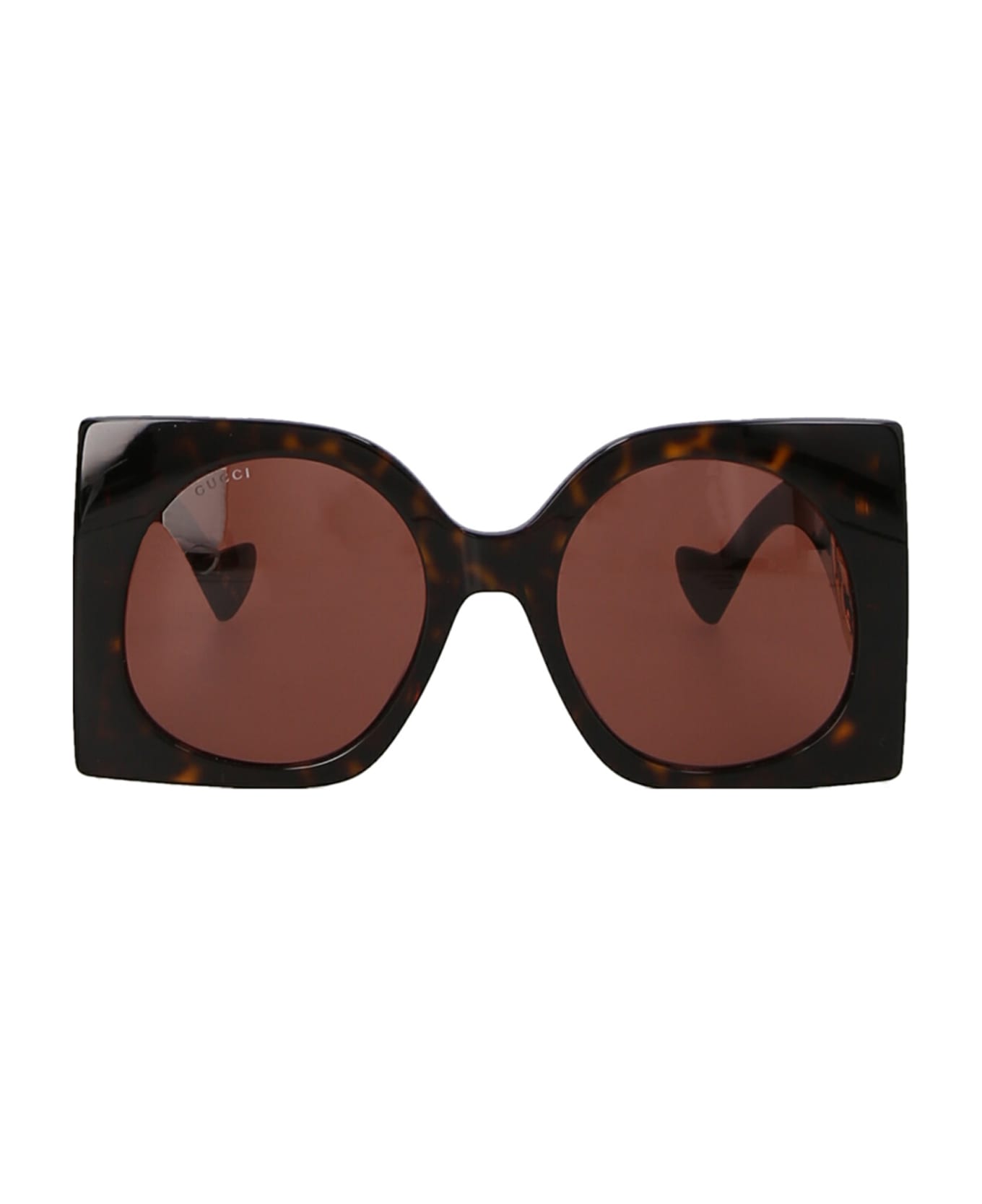 Square sunglasses with a shiny brown acetate frame, shiny brown acetate temples with cut-out Gucci interlocking detail and brown solid color lenses. TOTAL UVA/UVB protection Composition: 100% acetate