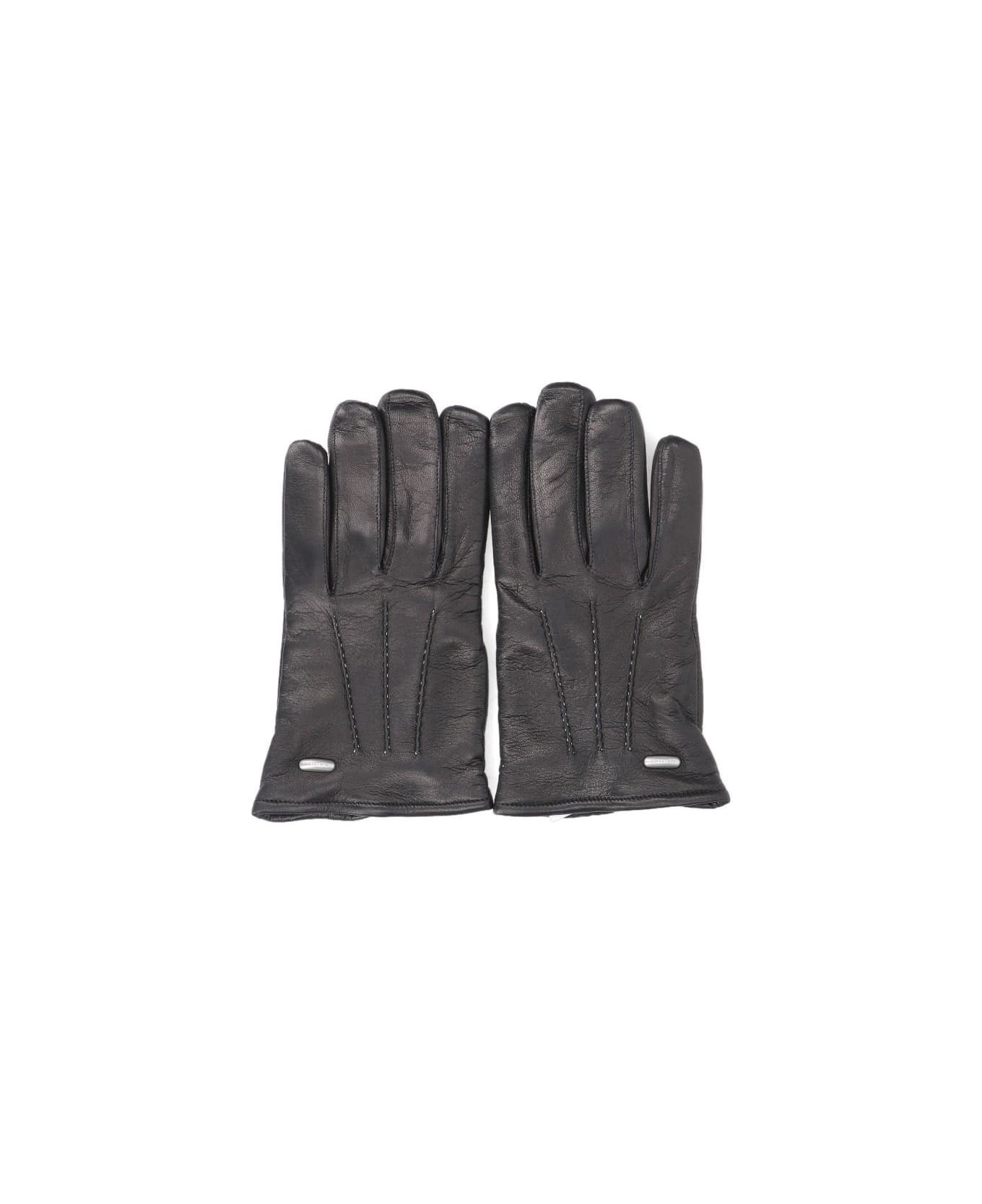 Our Legacy His Gloves gloves in black leather with front stitching details, and front silver logo tags.