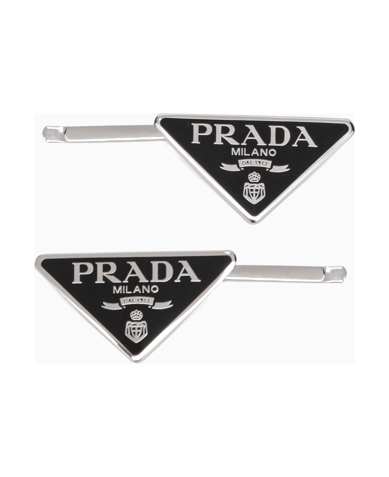 Set of two hair clips by Prada featuring a black logo plaque and a hinged structure. This item is non-returnable and non-refundable. Composition: 100%ACCIAIO-100%OTTONE