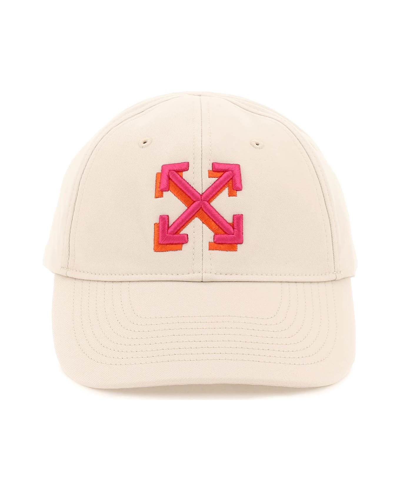 Off-White baseball cap in cotton gabardine, characterized by contrasting double-Arrow logo embroidery on front. Rear adjustable strap with silver-finished metal sliding buckle, embroidered eyelets, topstitched visor, cotton lining.