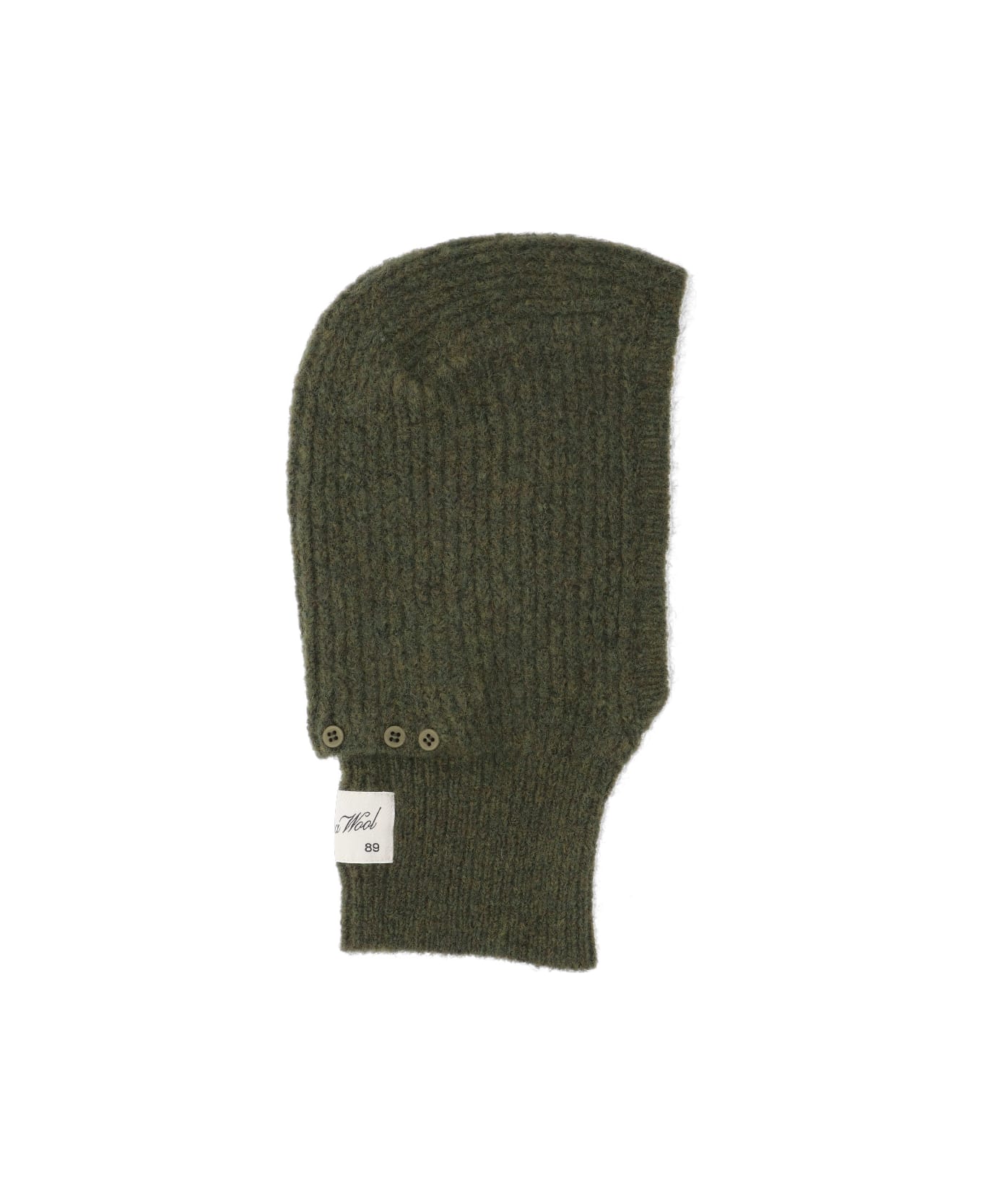 Paloma Wool "Angels III" balaclava in green stretch wool and alpaca blend with ribbed pattern, back button closure, logo label on the back.