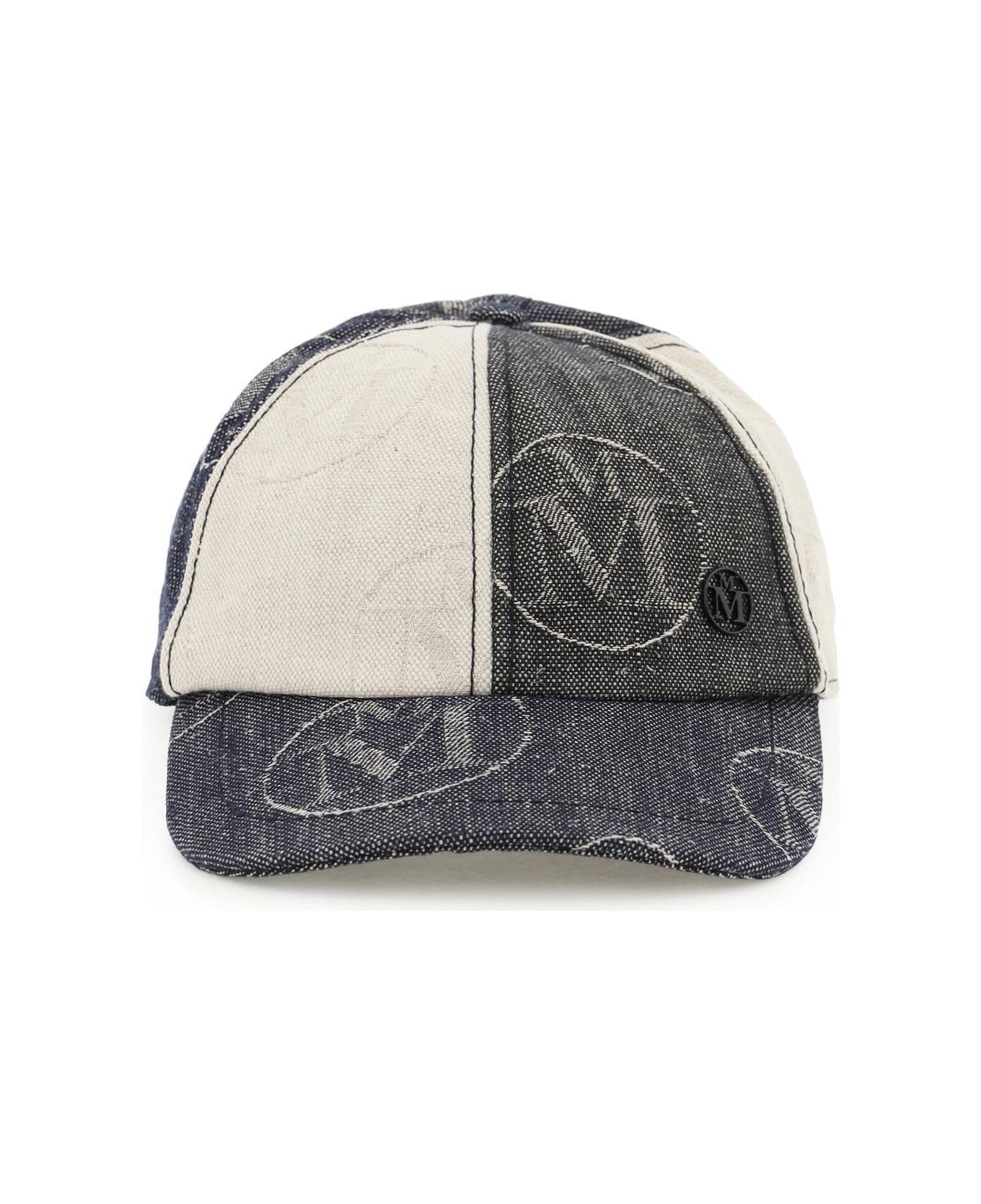 Tiger baseball hat from Maison Michel made of cotton and linen with jacquard logo denim effect. Small contrasting metal logo applied. Covered top button. Adjustable velcro strap. Unlined. Item in photo is size S.