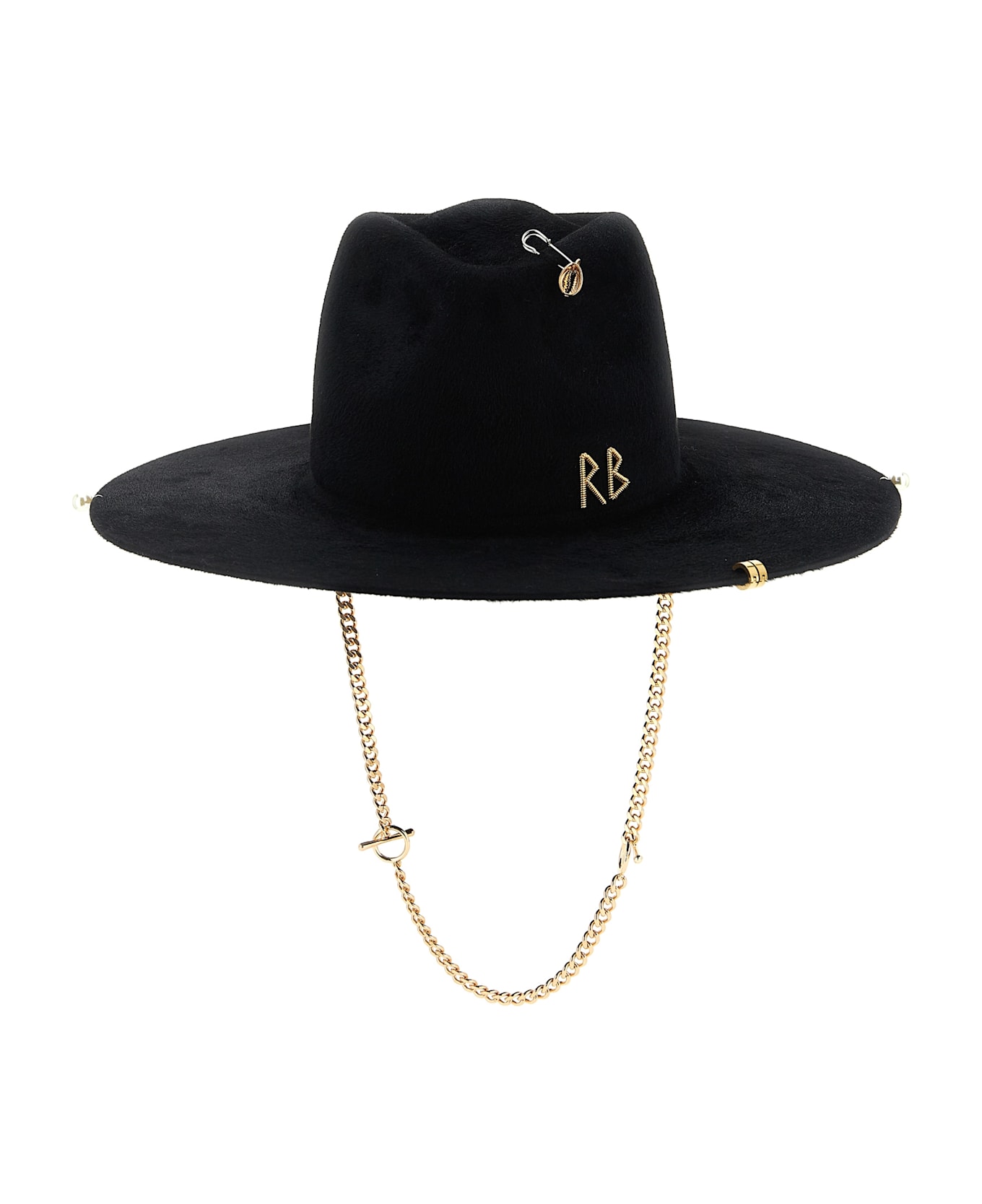 Chain Strap Fedora' wide-brimmed femora hat in fur-effect felt with brooch and charms appliqué, metal logo appliqué on the front, and removable under-neck chain. Composition: 100% fur felt