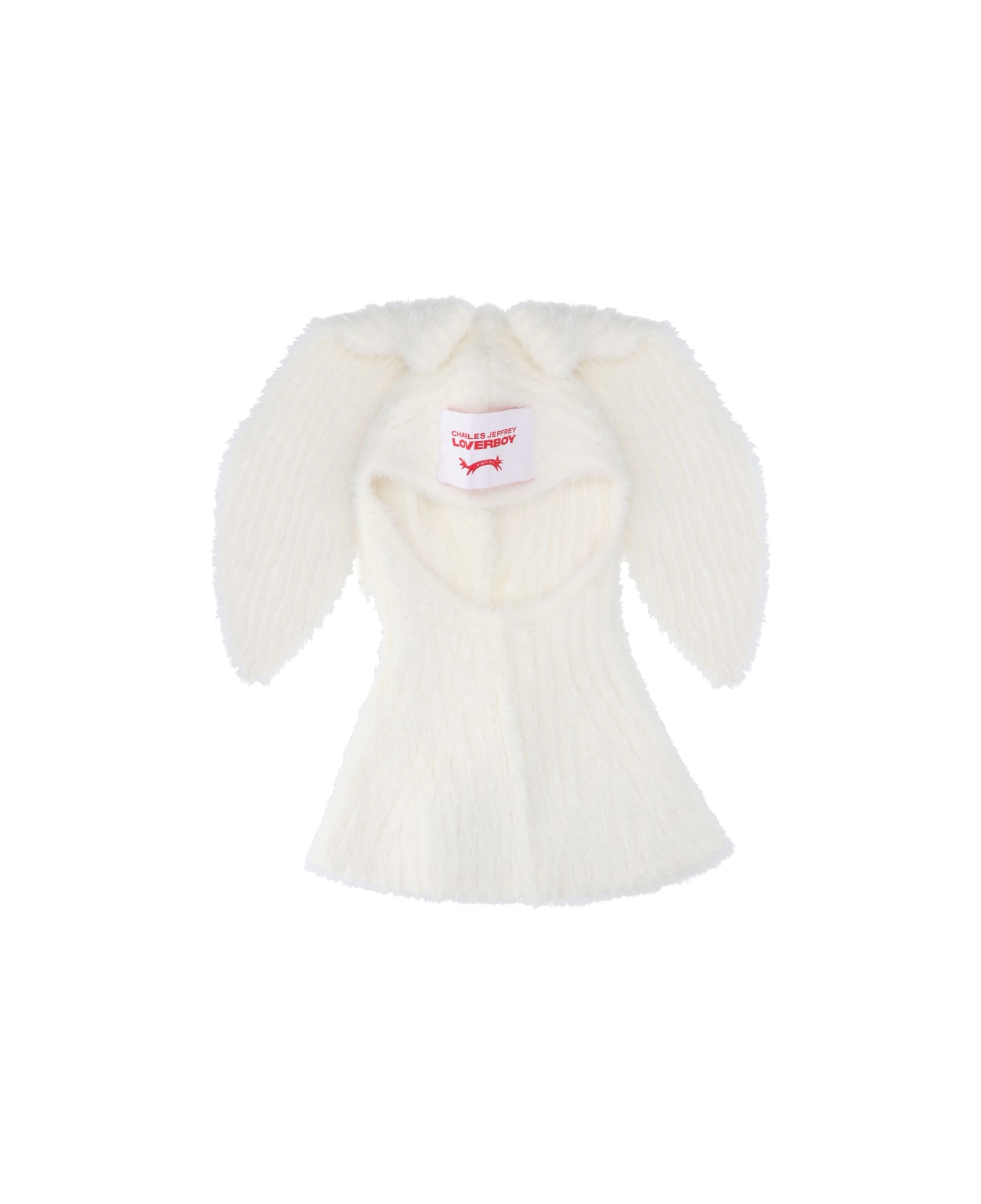Charles Jeffrey Loverboy "Fluffy Chunky Rabbit" balaclava, in white nylon with maxi ears detail, front logo patch.