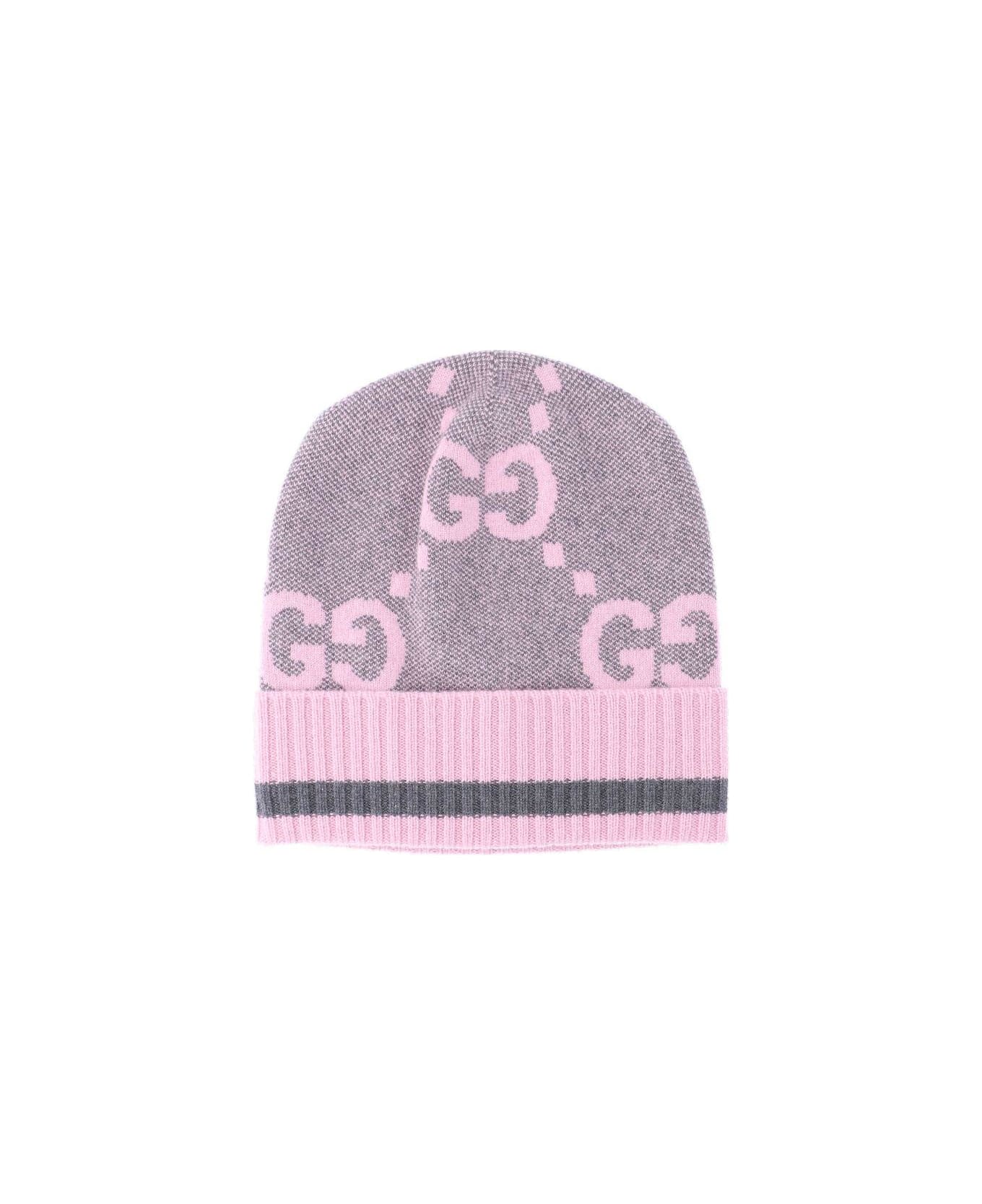 Gucci 'GG' Cashmere Hat, pink color, grey details, all-over 'GG' jacquard pattern all over, ribbed trim, grey ribbon detail.