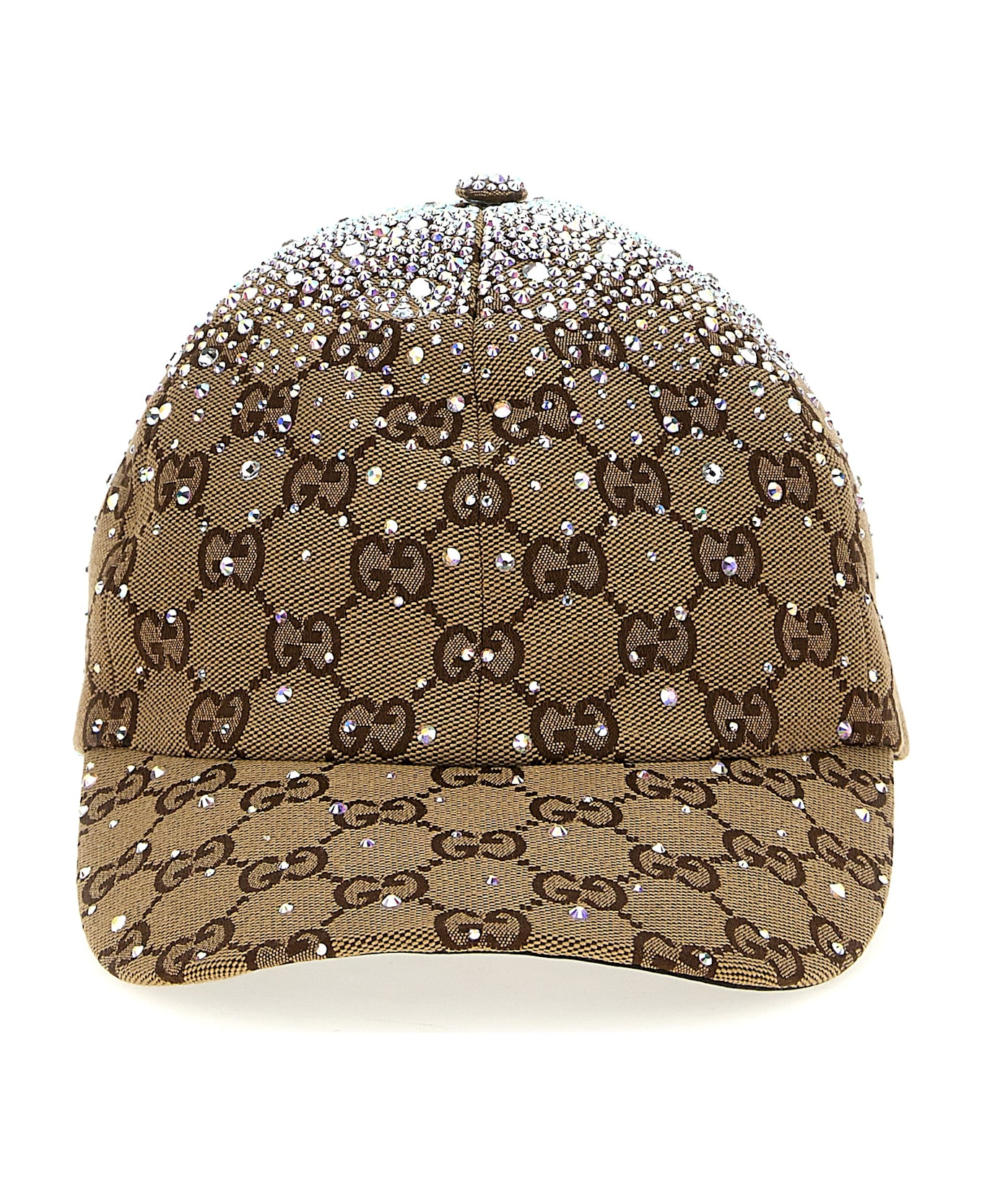 GG fabric cap with all-over rhinestone appliqué, leather details, adjustable strap. Composition: 100% lamb leather (Ovis aries)