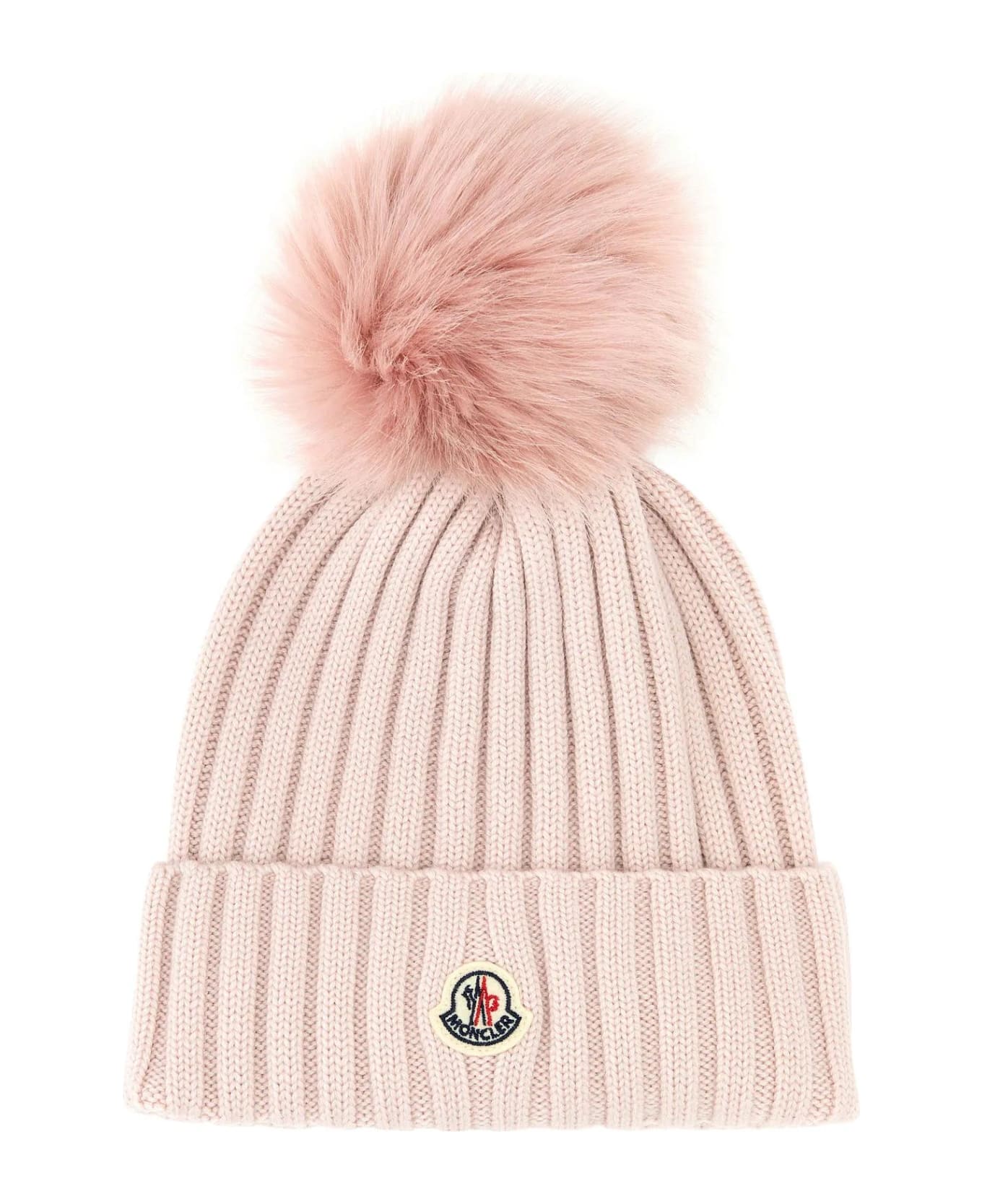 Beanie hat realized in pure ribbed virgin wool enriched by contrasting logoed patch at the front and tonal eco fur ponpon.