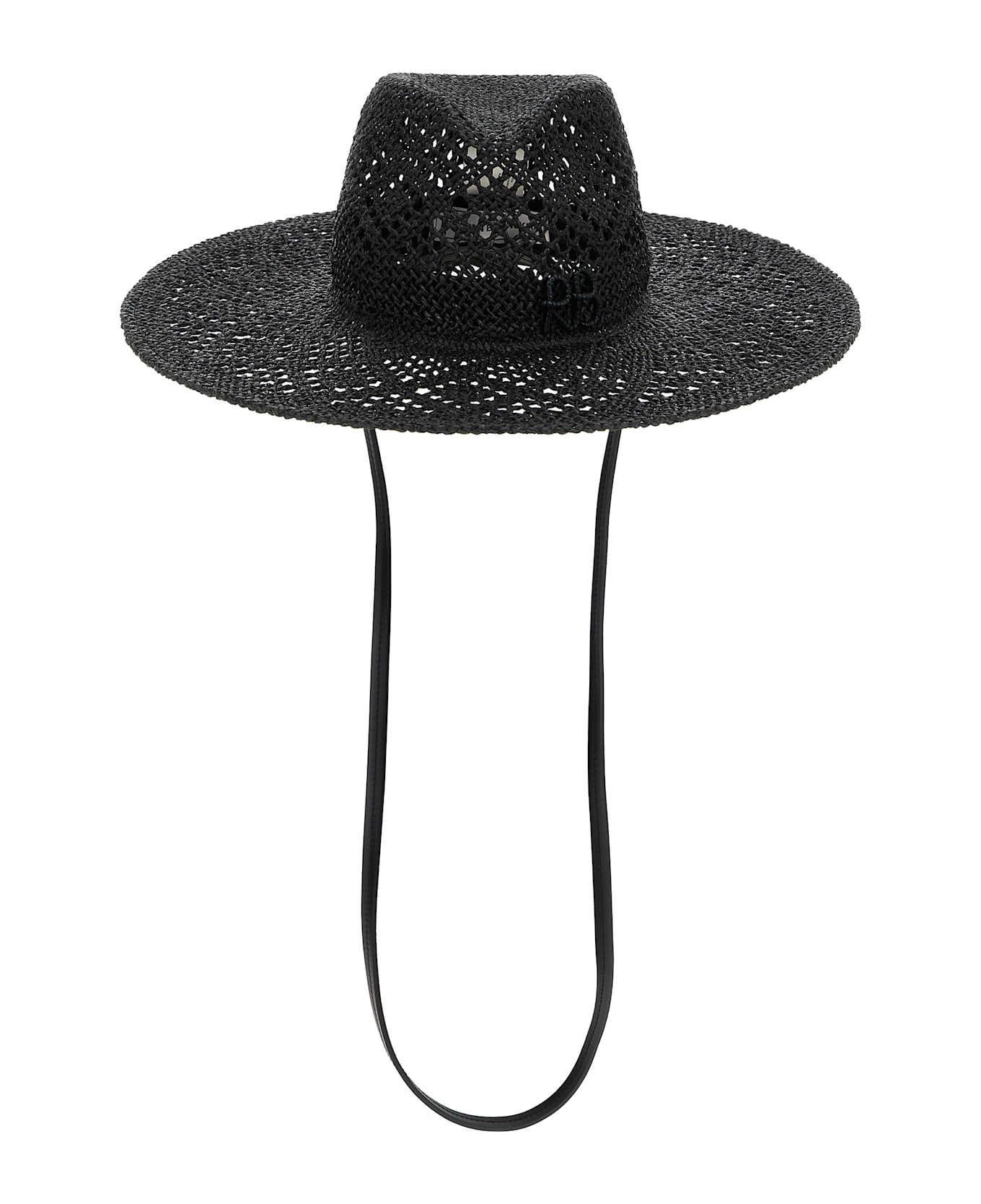 Braided raffia hat with all-over cut-out details, wide-brimmed Fedora, tone-on-tone logo appliqué on the front, and leather tape. Composition: 100% hay