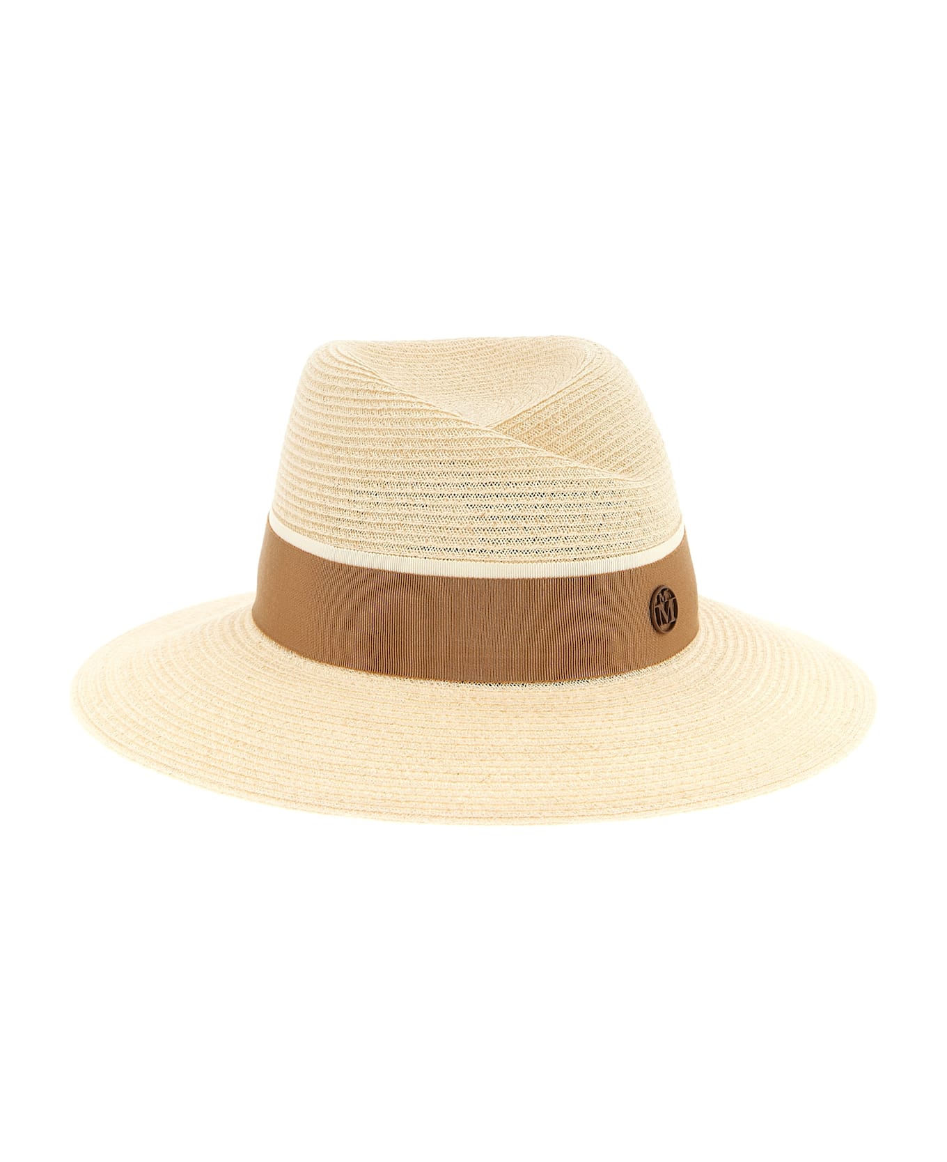 Virginie' hemp straw hat, Fedora model with grosgrain ribbon and tone-on-tone metal logo, wavy fold detail on the front on the cap.