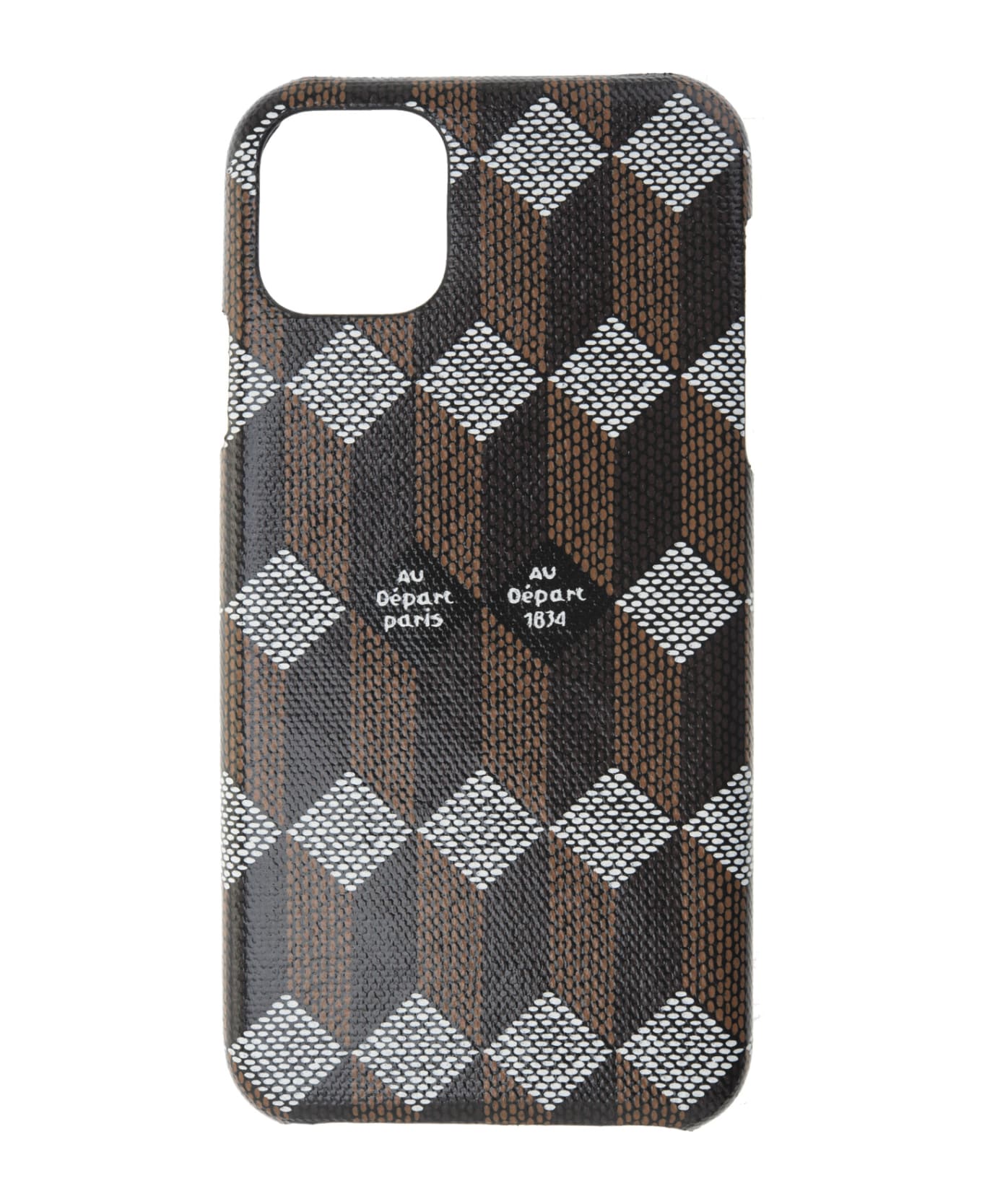 Black Monogram Au Depart case for iPhone 11 Pro Max made of reflective light Jacquard and polycarbonate and embellished with the Au Depart monogram. Internal Au Depart logo.
