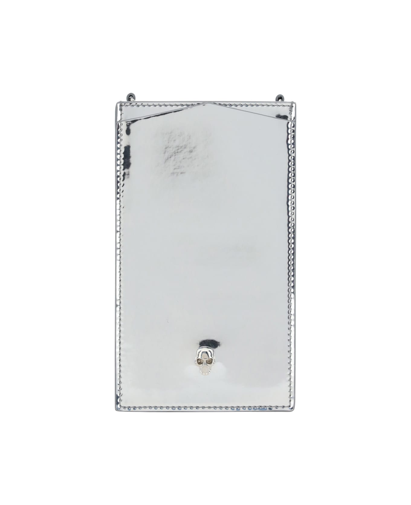 Cell phone case by alexander mcqueen, chain shoulder strap, shiny mirror effect design, iconic monogram i take pressure-printed on back, plaque with iconic three-dimensional skull logo applique on front.
