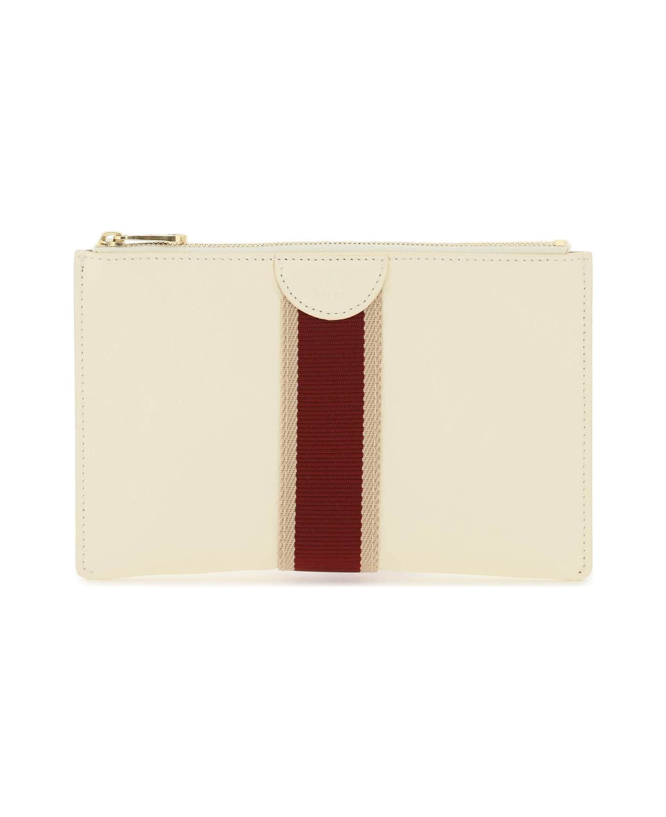 Volonata leather pouch from Il Bisonte with two-tone applied ribbon and embossed lettering logo. Zippered closure and lined interior.