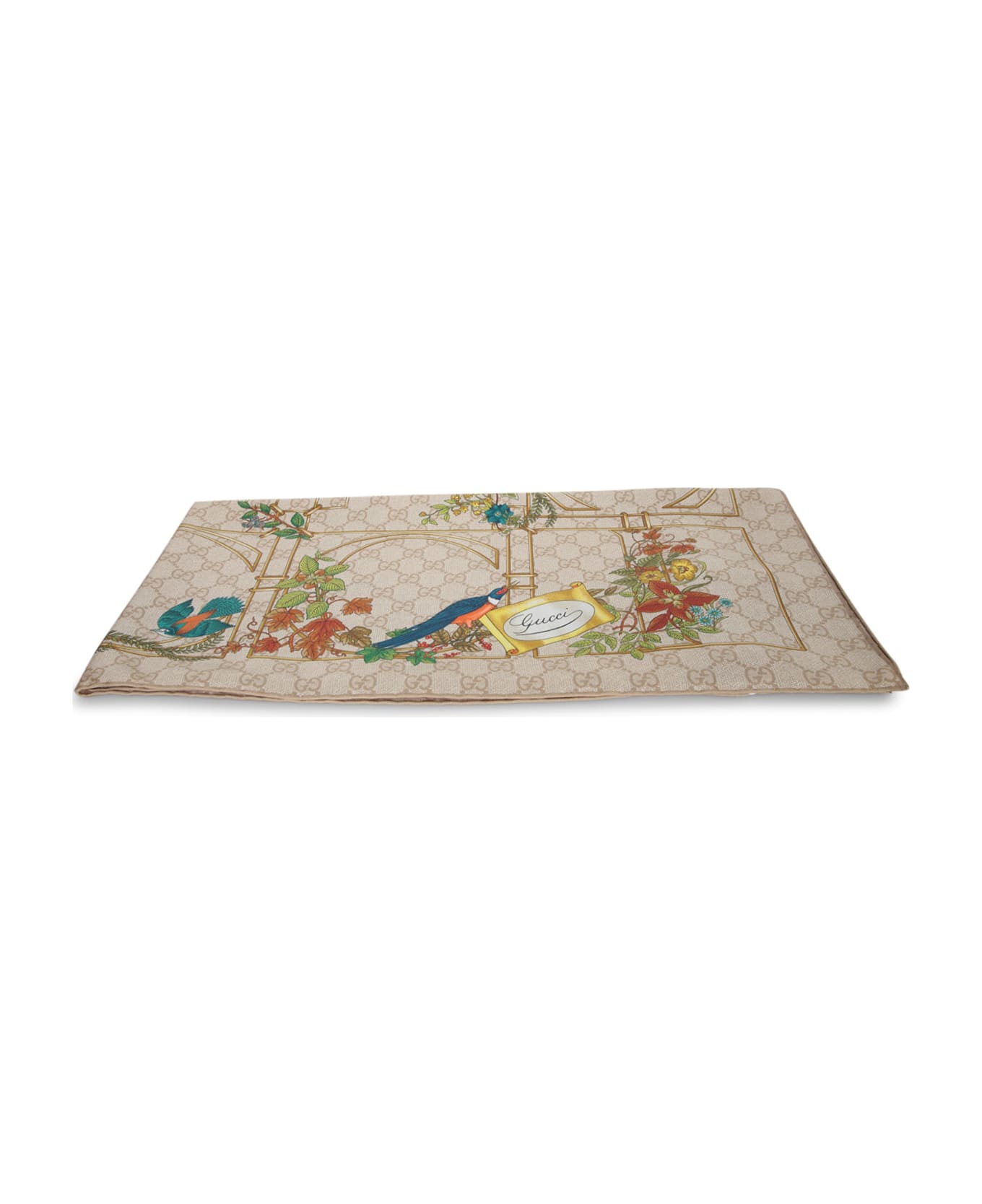 This elegant Gucci scarf is embellished with a vibrant print that blends the iconic GG motif with botanical elements and a colorful parrot. Perfect for adding a touch of class to any outfit. Composition: 100% Silk
