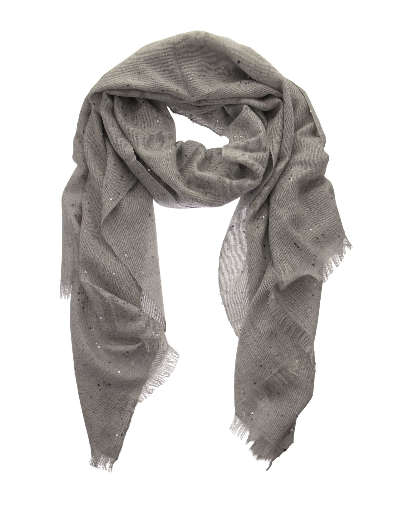The quality and workmanship of Brunello Cucinelli materials brings out the style of the scarf with a sophisticated touch. A soft and slightly shiny texture of the cashmere and silk Diamond yarn enhances the accessory with a precious sparkling effect spread by small paillettes incorporated into the yarn. - Short side with fringe DESIGNER ID: MSC915029 C072 Composition: 70% Cashmere, 30% Silk Paillettes: 100% Polyamide Composition: 70% Ws, 30% Se