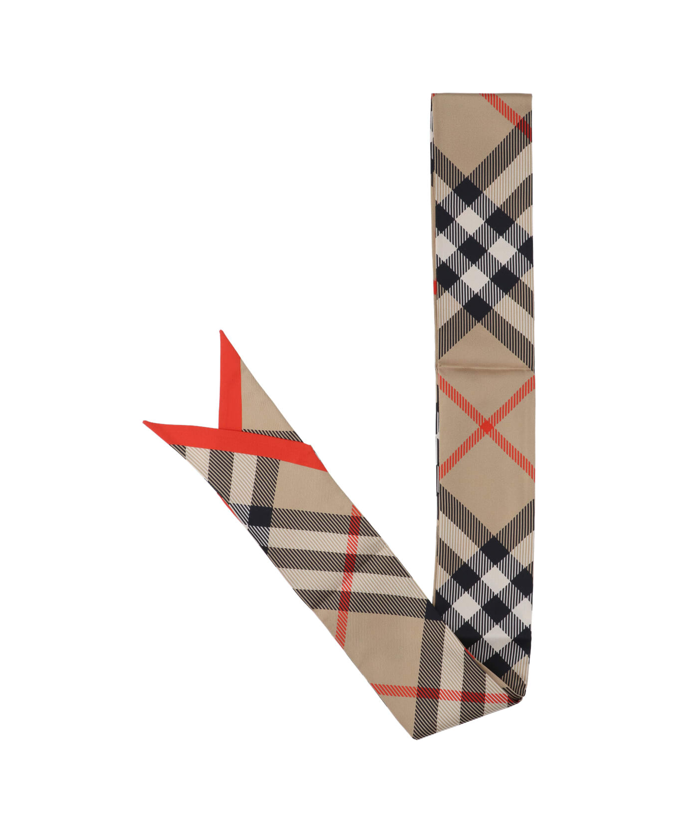 Burberry 'Check' beige silk scarf with black, white and red details, logo label, red hem. Composition: 100% Silk