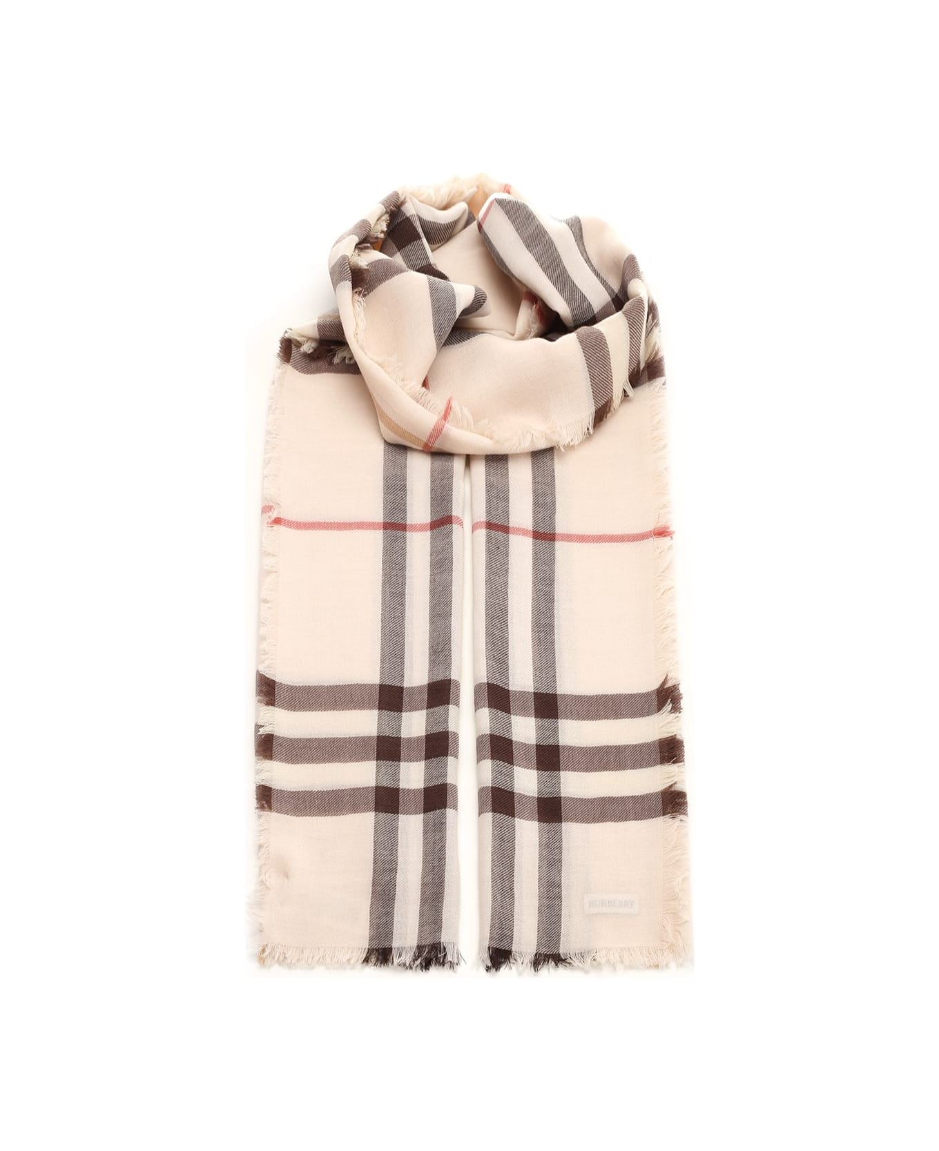 Burberry 'Check' wool scarf in cream wool with black and red details, texutre effect, fringed design. Composition: 100% Wool