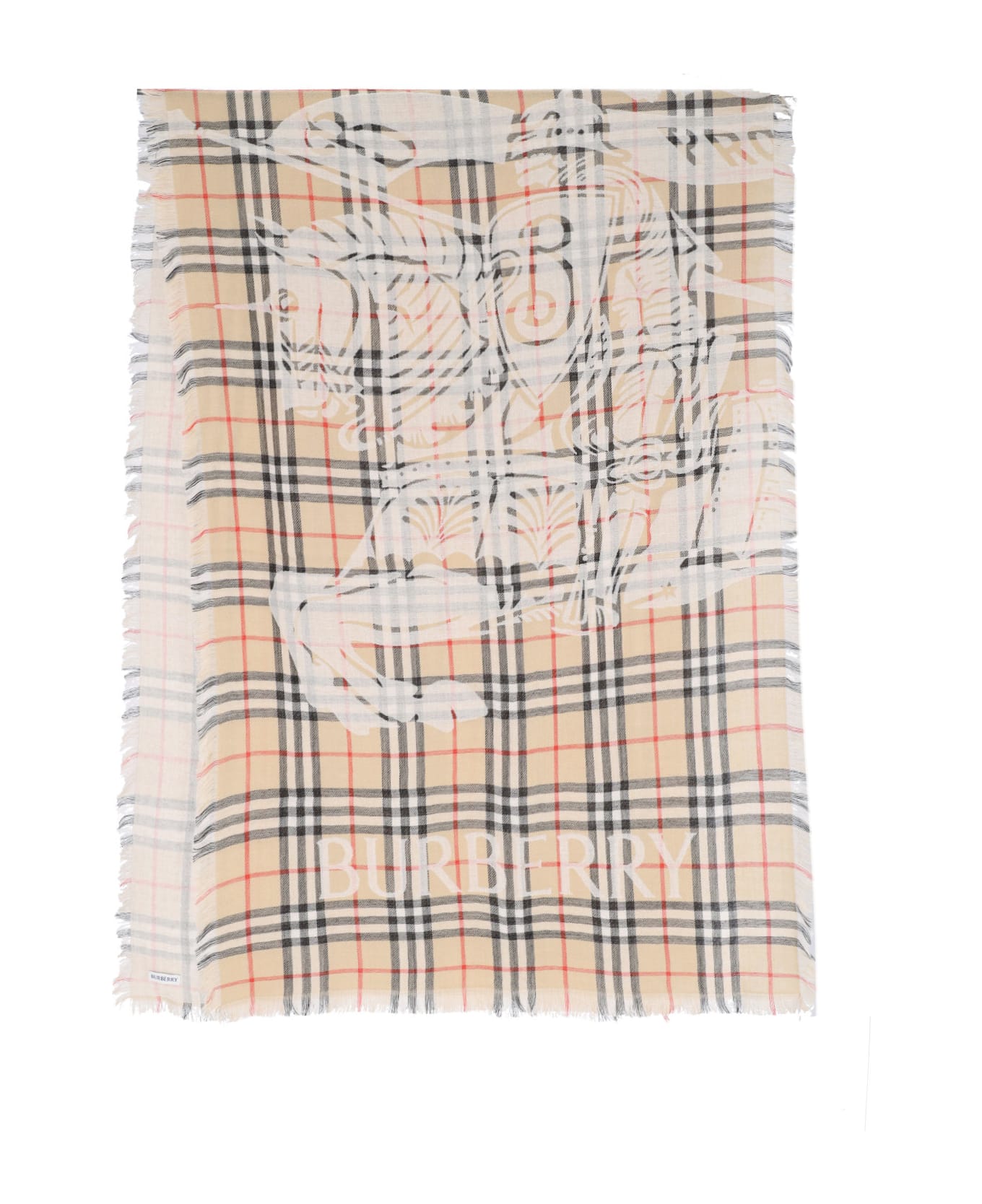 Burberry 'EKD' beige wool scarf with iconic multicolor 'Check' pattern, maxi white logo intarsia on the front, logo label on the back, frayed edges, rectangular shape. Composition: 100% Wool