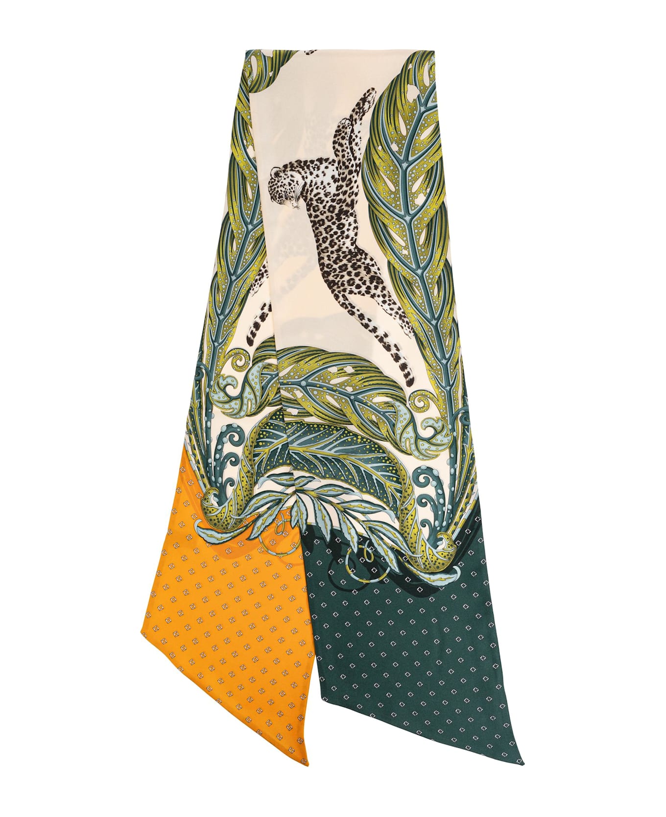 Exuding a spirit of refined sophistication, this Silk Printed Scarf by FERRAGAMO is an embodiment of timeless luxury. The classic, slightly elongated silhouette with gently pointed ends offers versatile styling options, adapting effortlessly from casual to formal ensembles. Crafted from exquisite, smooth silk, its delicate sheen and airy texture are a testament to superior artisanship. The scarf features a stunning print: a dynamic, meticulously detailed leopard poised among lush, stylized foliage an artistic celebration of nature. Contrasting geometric micropatterns grace both ends, lending an unexpected modern twist. Every motif is rendered with impeccable precision, a subtle display of craftsmanship free from overt designer logos. Dlaczego warto kupi ten produkt? Distinguished FERRAGAMO artistry with a unique, nature-inspired design Lustrous, lightweight silk ensures a luxurious look and touch Versatile shape for creative and elegant styling Impeccably detailed prints for a statement-making accessory A discreet emblem of sophisticated Italian heritage