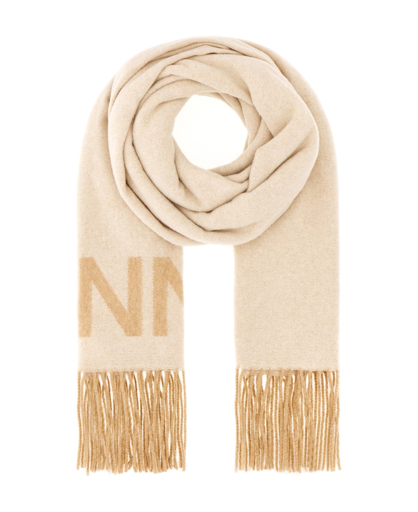 Scarf realized in wool blend characterized by tonal embroidered logo at the end. -Fringed hems Composition: Exterior: 90% Recycled wool 10% Wool