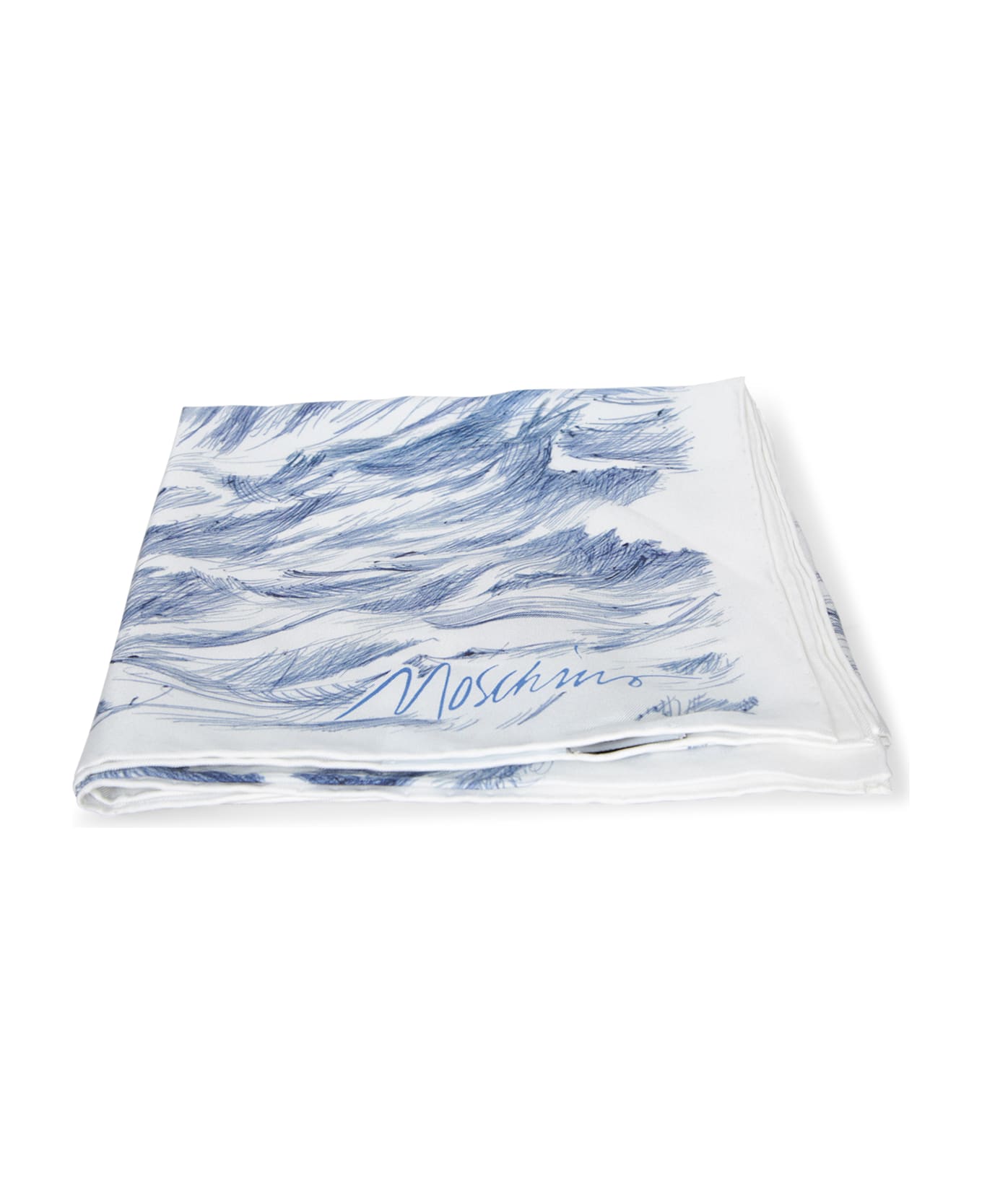 Elevate your style with this elegant Moschino scarf, featuring an eye-catching trompe l'oeil print that mimics artistic brush strokes in blue on a white background. Perfect for adding a touch of sophistication to any outfit. Composition: 100% Silk