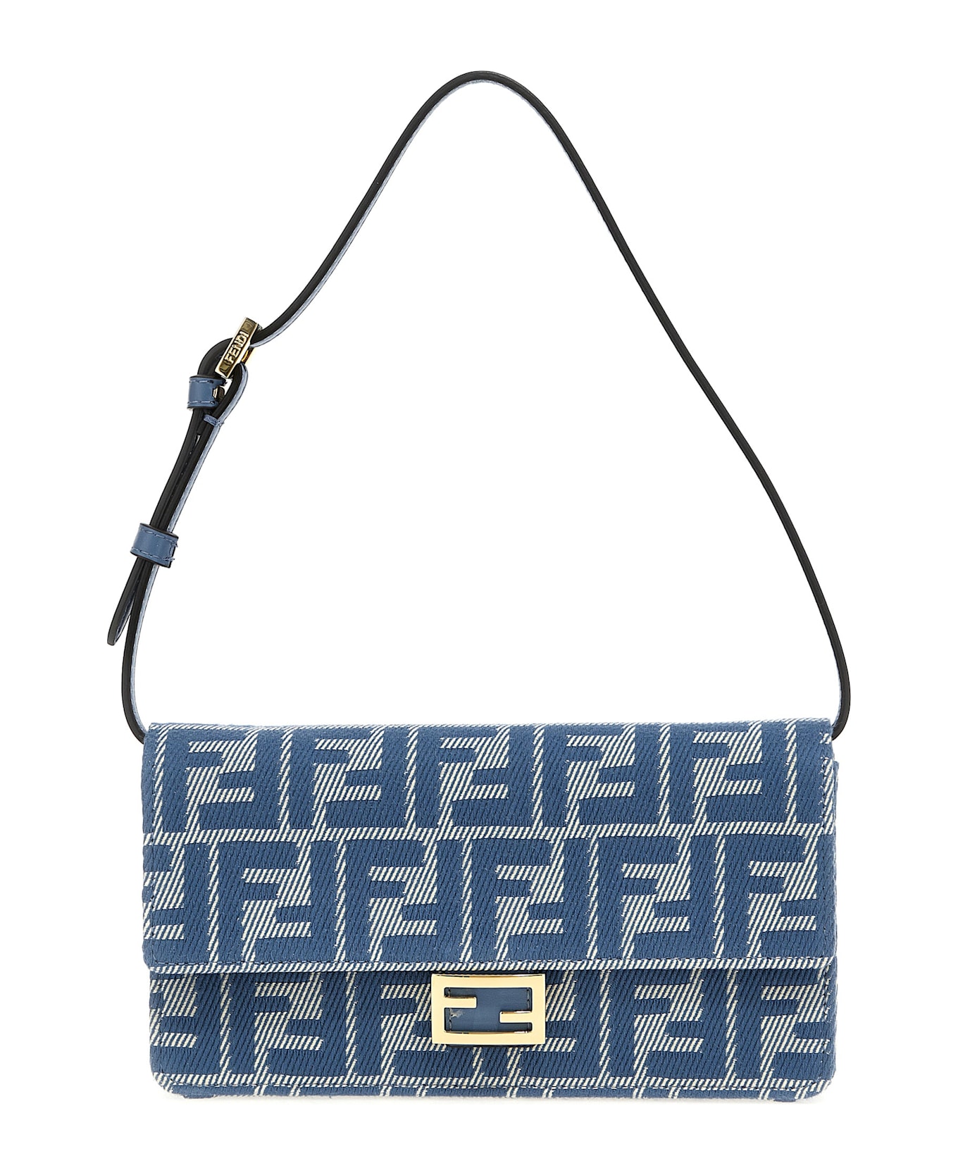 'Baguette' wallet on chain in FF jacquard with denim effect, flap closure with snap button and front metal logo, adjustable and removable leather handle, removable chain shoulder strap. Composition: 100% cotton