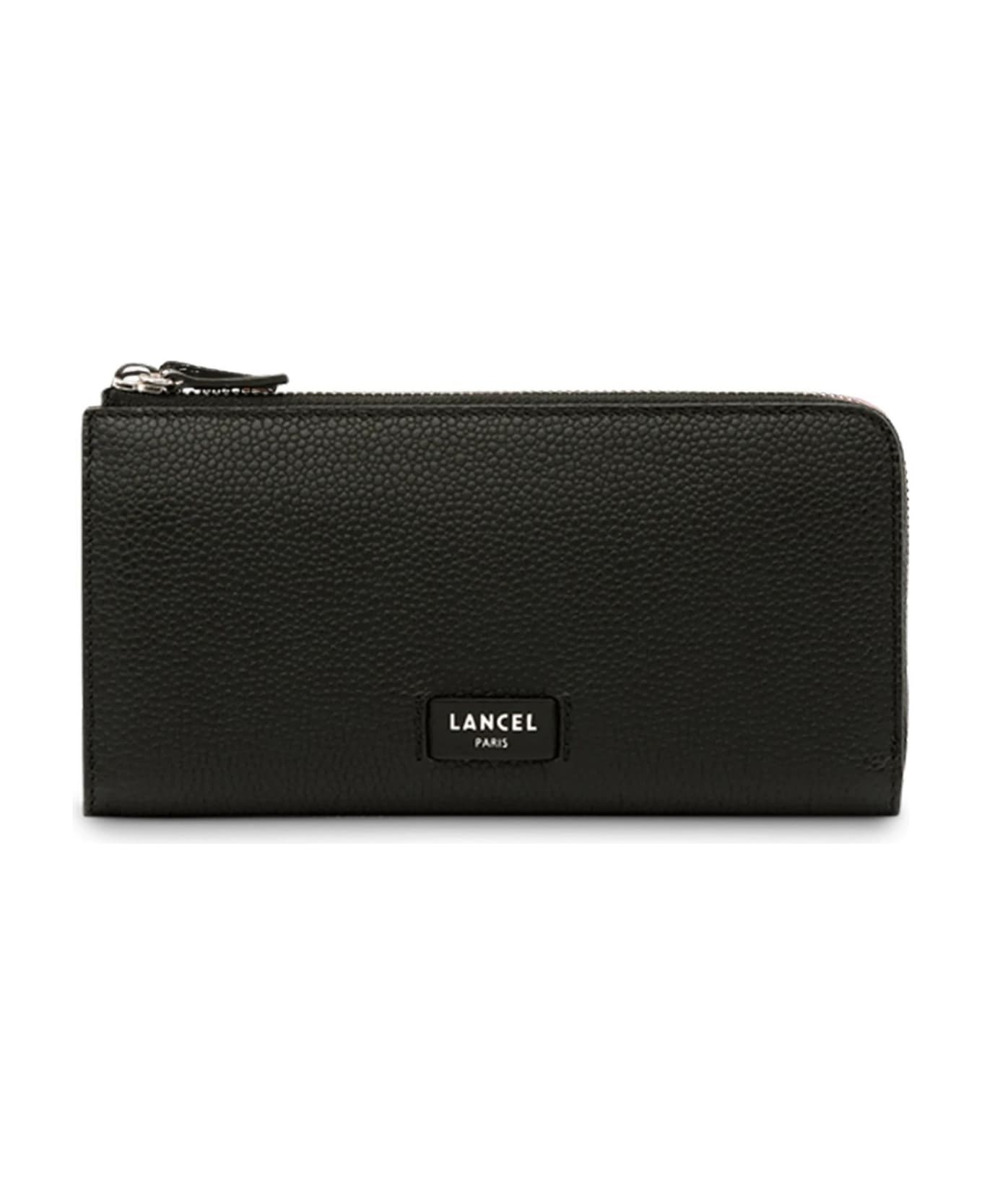 Black grained leather wallet, red grosgrain lining, two multifunctions patch pockets, two compartments for notes, papers, tickets, one zipped coin compartment, eight credit card slots, 19,5 x 9 x 1,5 cm